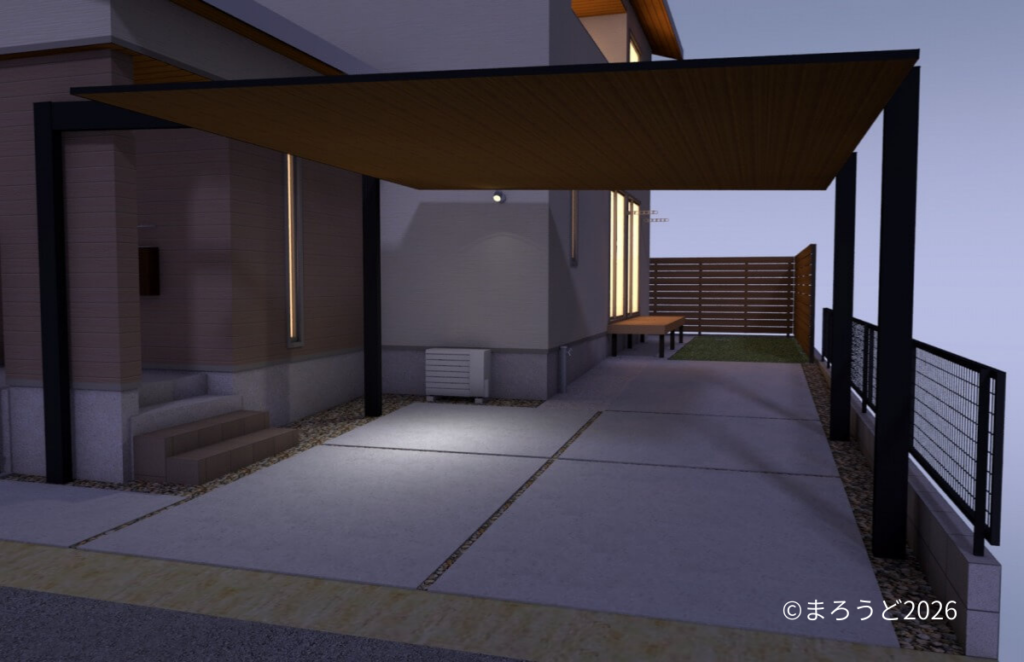 壁面スポットライトの位置とカーポートはお施主様のこだわりでとても素敵な夜の演出ができました。