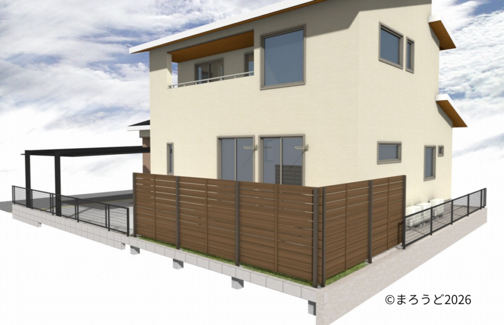 お庭部分を目隠しフェンス「グローベン プラドリッチプラス H1800」をⅬ字に独立施工しました。