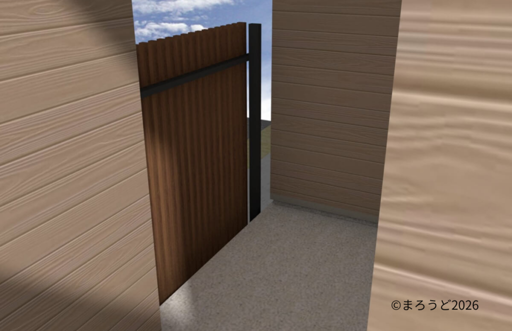玄関前はサイドから出入りできるようにし、スクリーン「LIXIL ブログコートフェンスF1型 H2000 クリエモカ+ブラック」で目隠ししました。