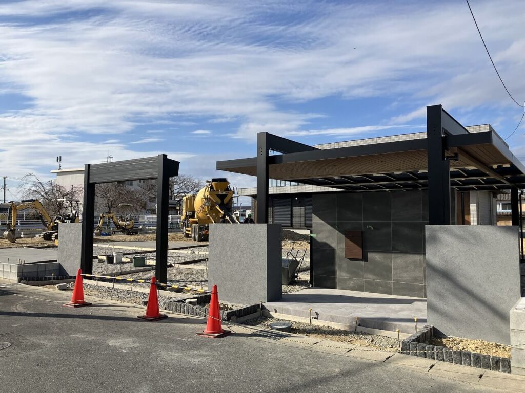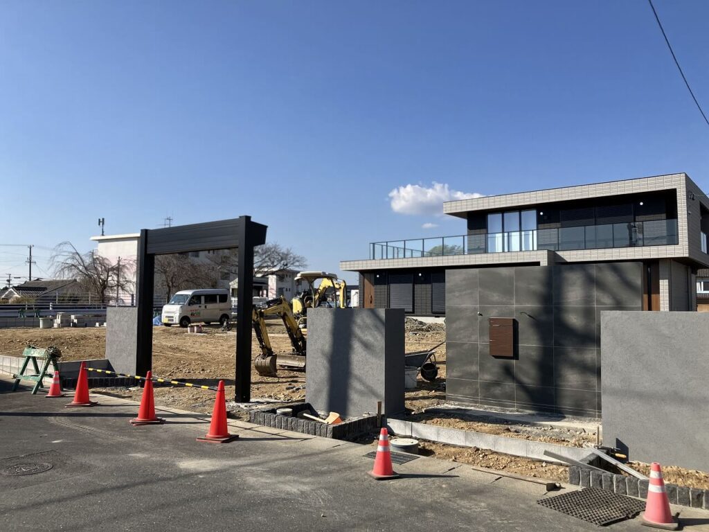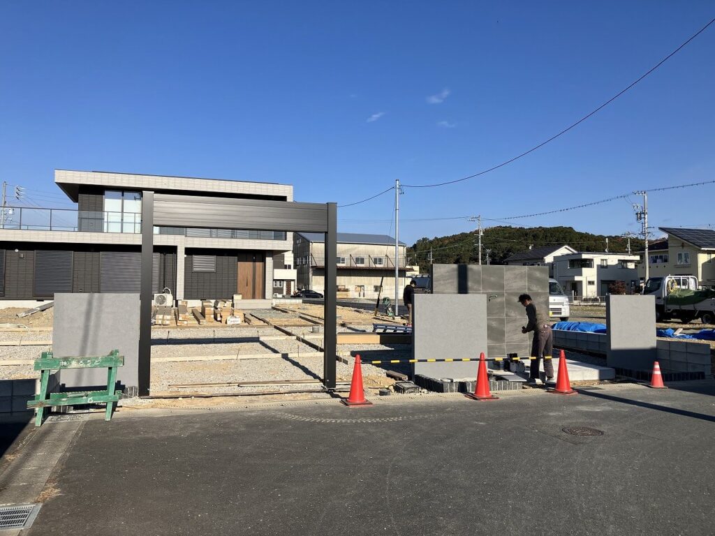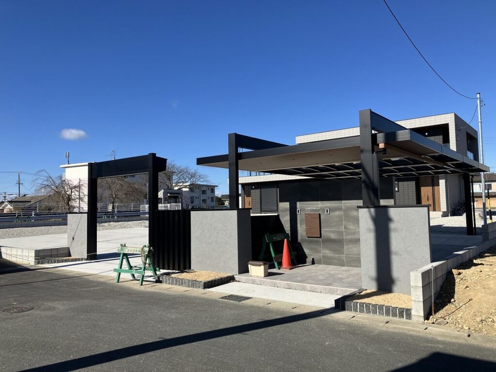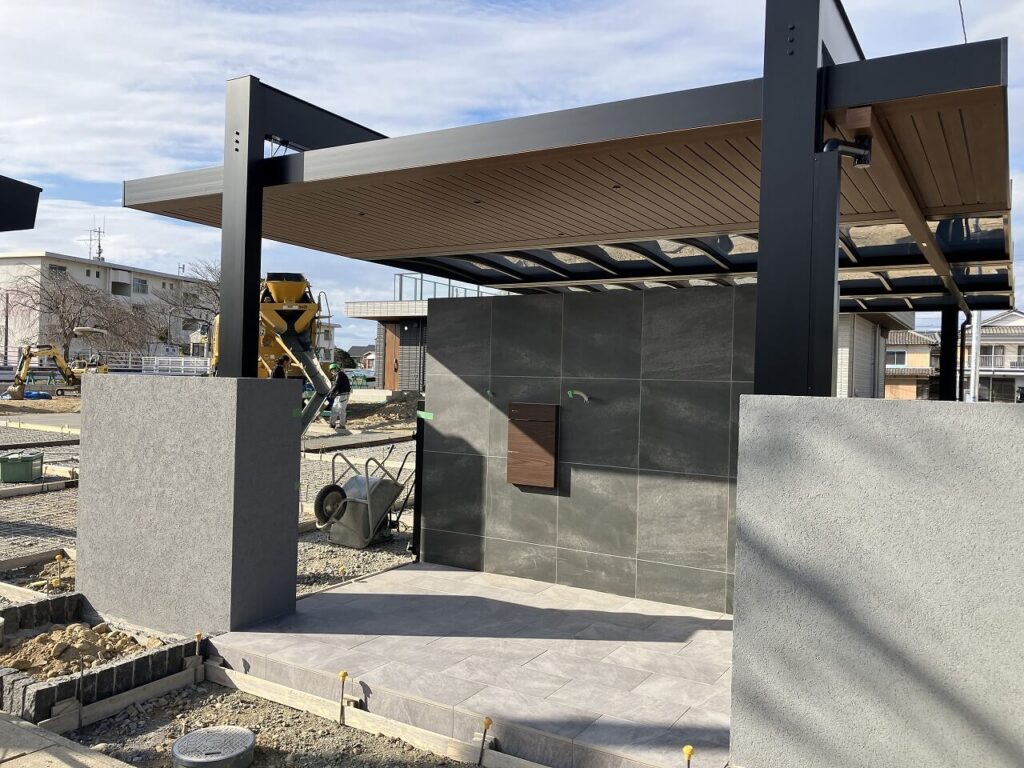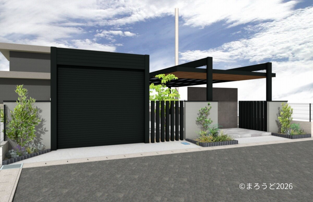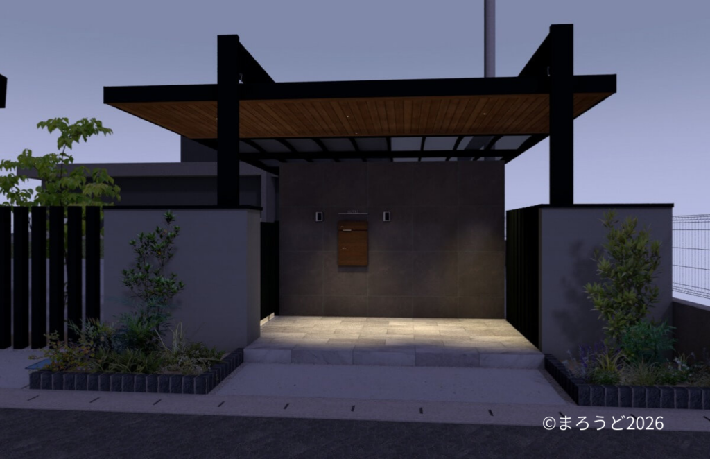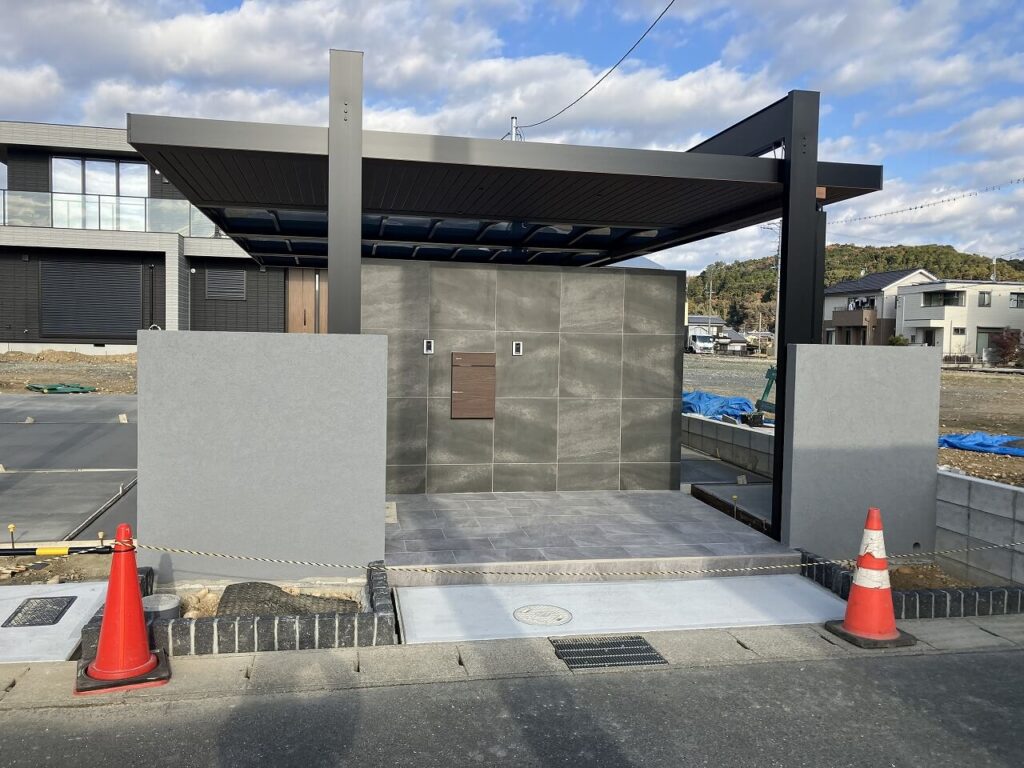 門壁とシャッターゲートのサイドには塗壁を設置し、門壁前のポーチはタイル「アイコットリョーワ ルイーダ 600×300角」貼りしました。