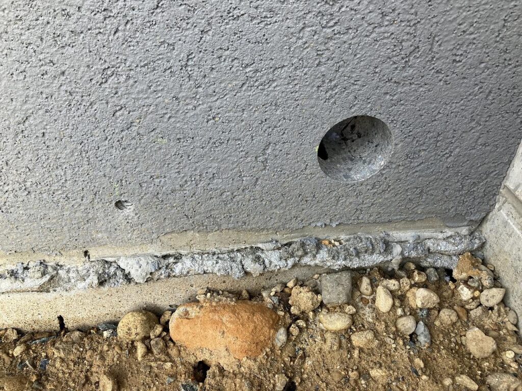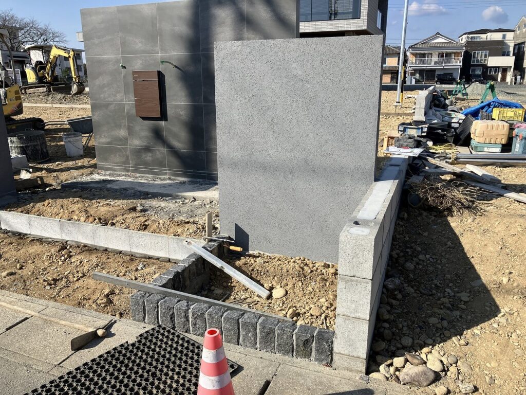 塗壁には笠木「三協アルミ フィオーレ ブロック笠木」をつけ、塗壁前には見切り「TOYO ピンコロ 黒ミカゲ」で3ヶ所の植栽スペースを設けました。