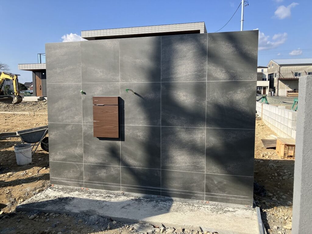門壁はタイル「名古屋モザイク ラヴィータ 600角」貼りしました。宅配ポスト「ユニソン ヴィコDB100 ウォールナット」、インターホン2つ、表札「オンリーワン ライン Mサイズ シルバー」を設置します。