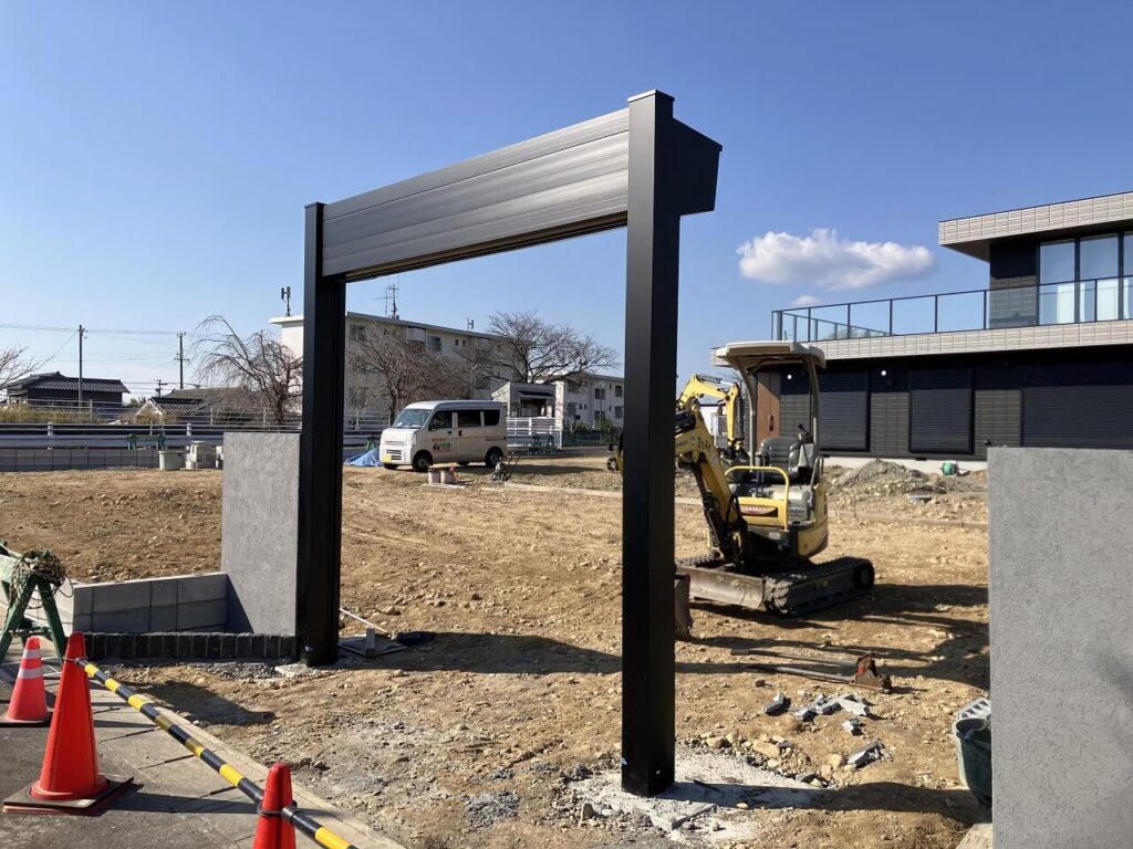 シャッターゲートと塗壁の間は角柱「三協アルミ マクリズム 100角 H1600 ブラック」を7本並べました。