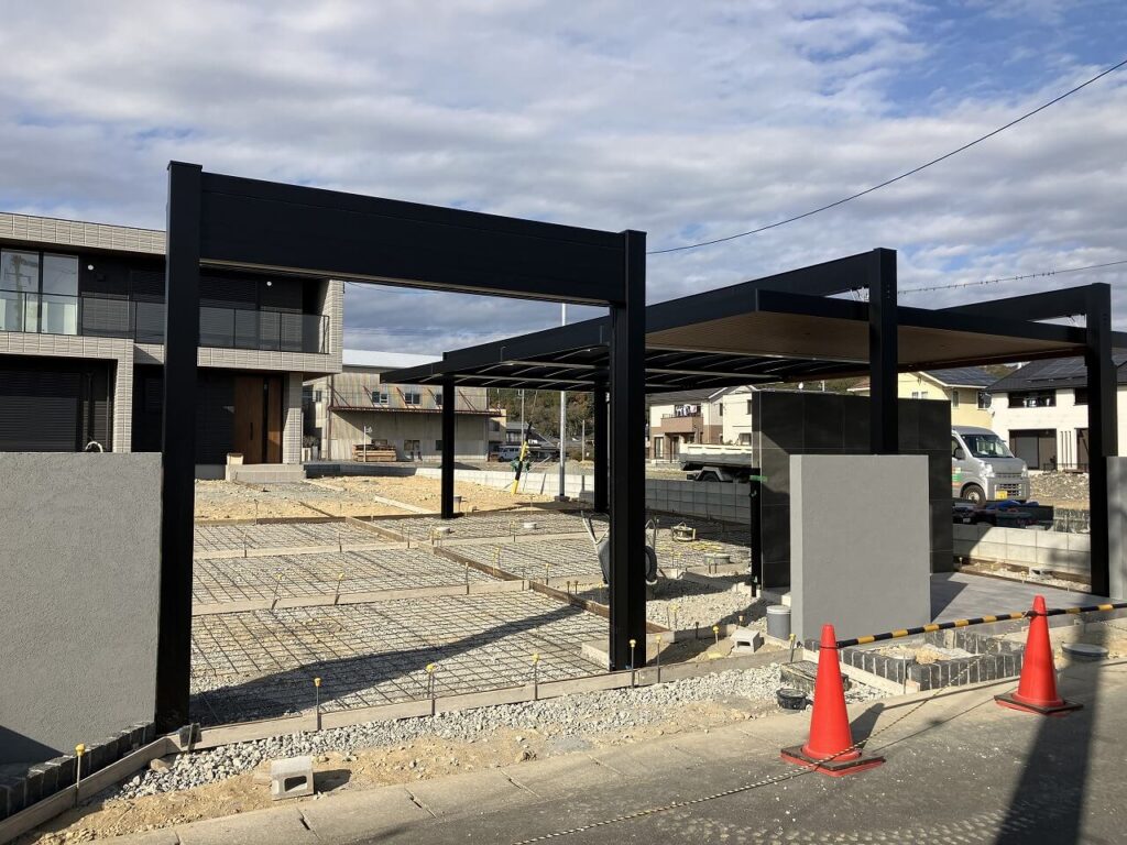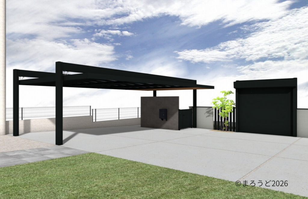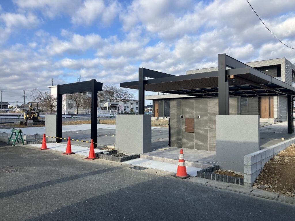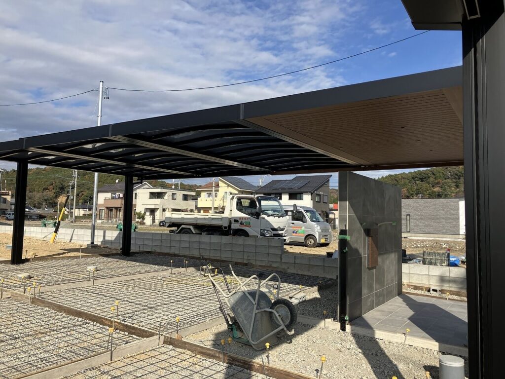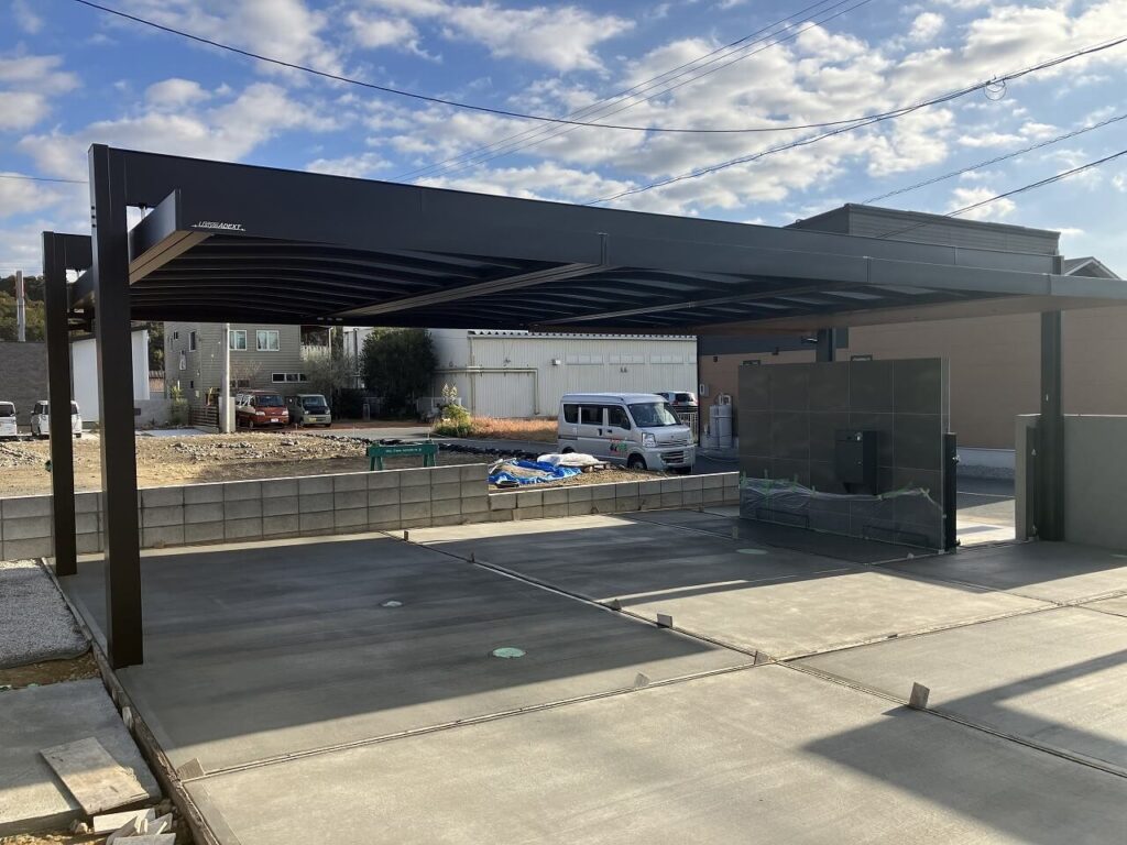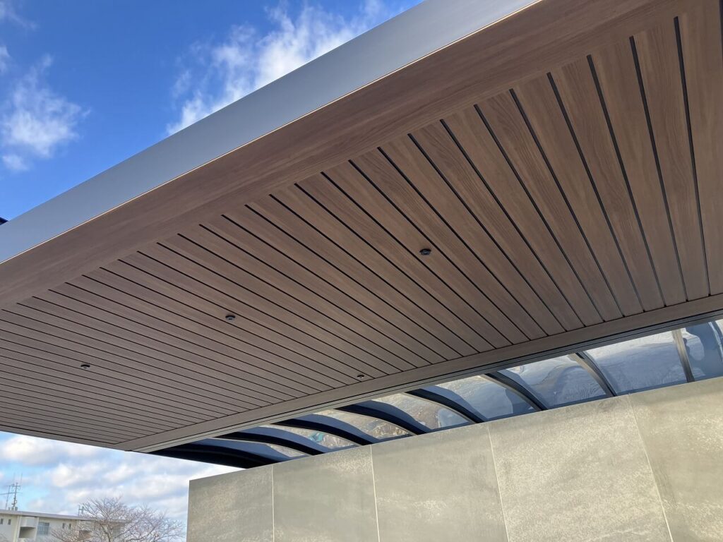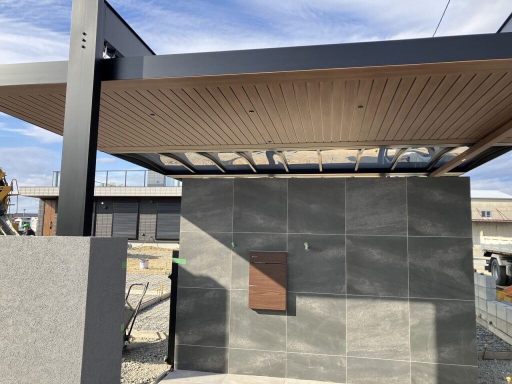 カーポート「三協アルミ U.スタイルアゼスト 吊下げ式」を設置しました。3台分は屋根材をスタンダードタイプで熱線ポリカ(ブルースモーク)、エントランス上のみプレミアムタイプで天井材を木調(クラフトチェリー)にしました。ダウンライト4灯で夜も明るく照らします。