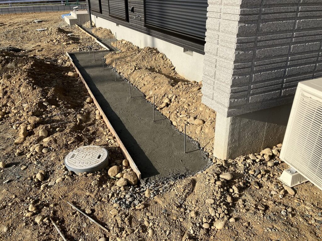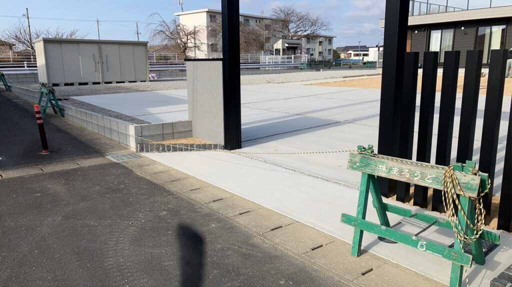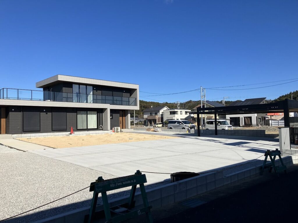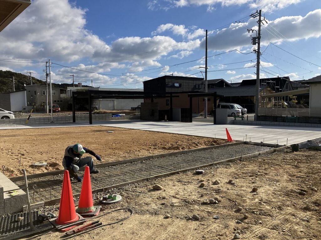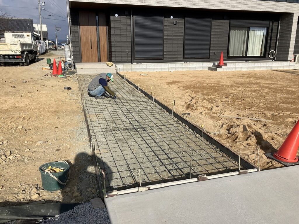 駐車場、シャッターゲート、門壁前はコンクリート刷毛引き仕上げ、角のかけをなくすために面取りもしています。