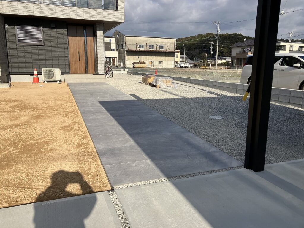 アプローチは左右ともタイル「アイコットリョーワ ルイーダ 600角」貼りしました。