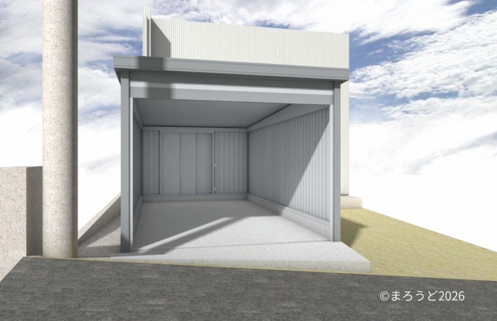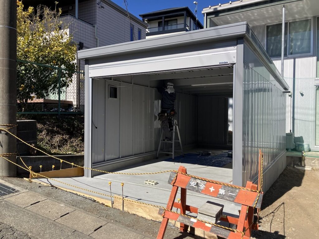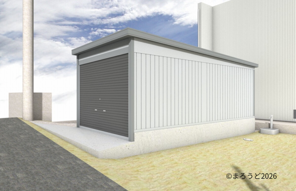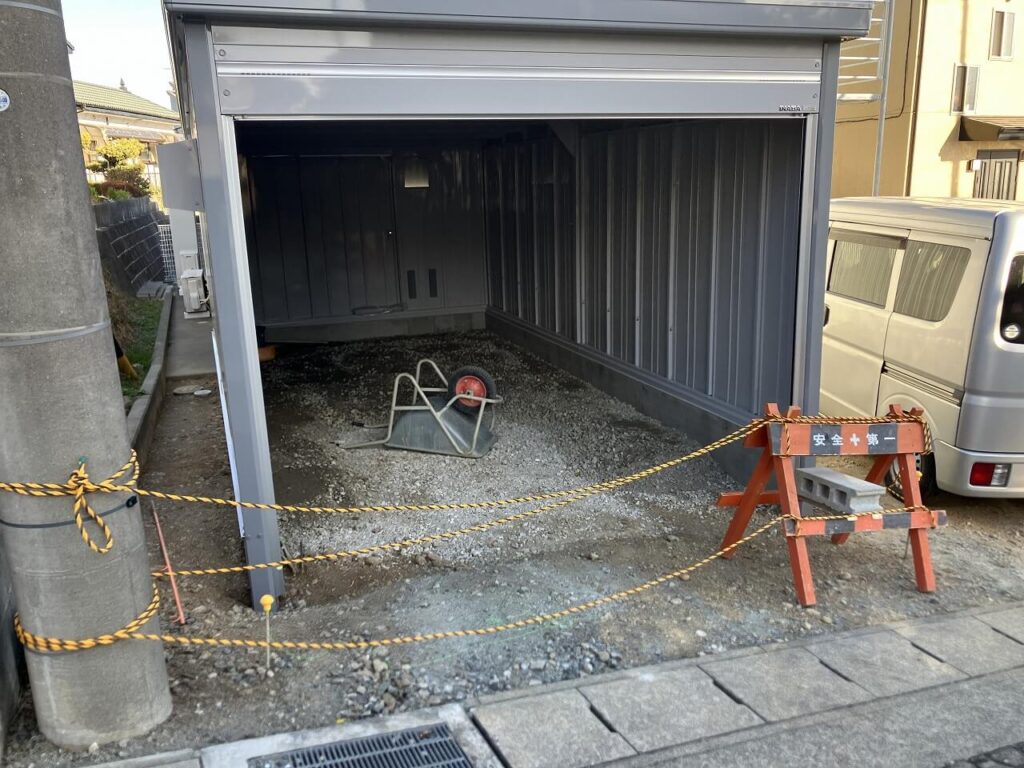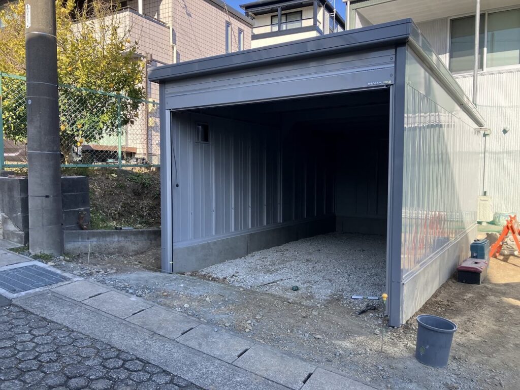ガレージ「イナバ ガレーディア」を設置し、オプションで壁面扉、リモコンシャッター、フード付メッシュパネル、フード付20cm換気扇取付パネル、雨樋を取り付けしました。