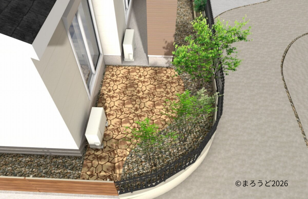 お庭はスタンプコンクリート「MAT ランダムストーン クリーム+コーヒーブラウン」を施工しました。