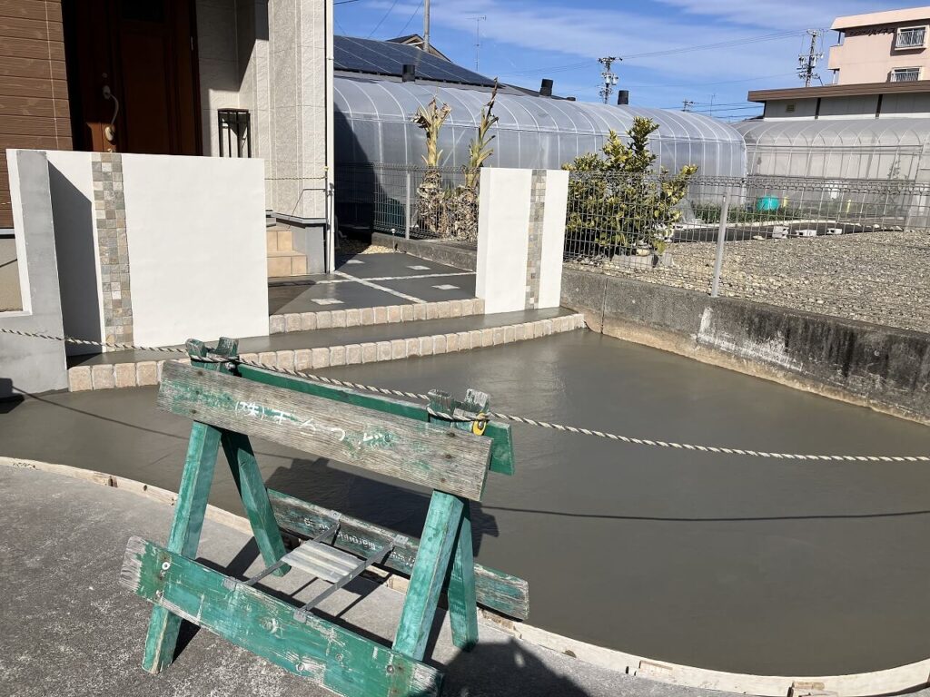 駐車場、階段、アプローチはコンクリート打ちしました。アプローチには天然石「ユニソン クレモナピース 100角 ゴールデンイエロー」をアクセントで入れています。