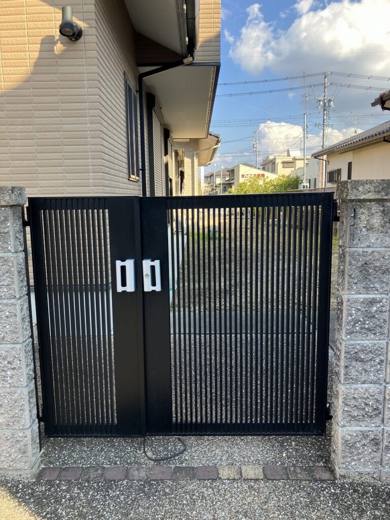 門扉「三協アルミ レジリア門扉 T2型 親子開き」と角柱「三協アルミ マクリズム 75角」を2本設置しました。