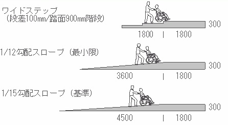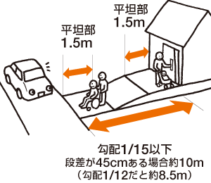 それとスロープの始まりと終わりには必ず水平区間が必要です。長いスロープですと、高さ75cm以下ごとに1.5m以上の踊り場を設置するのが望ましいです。