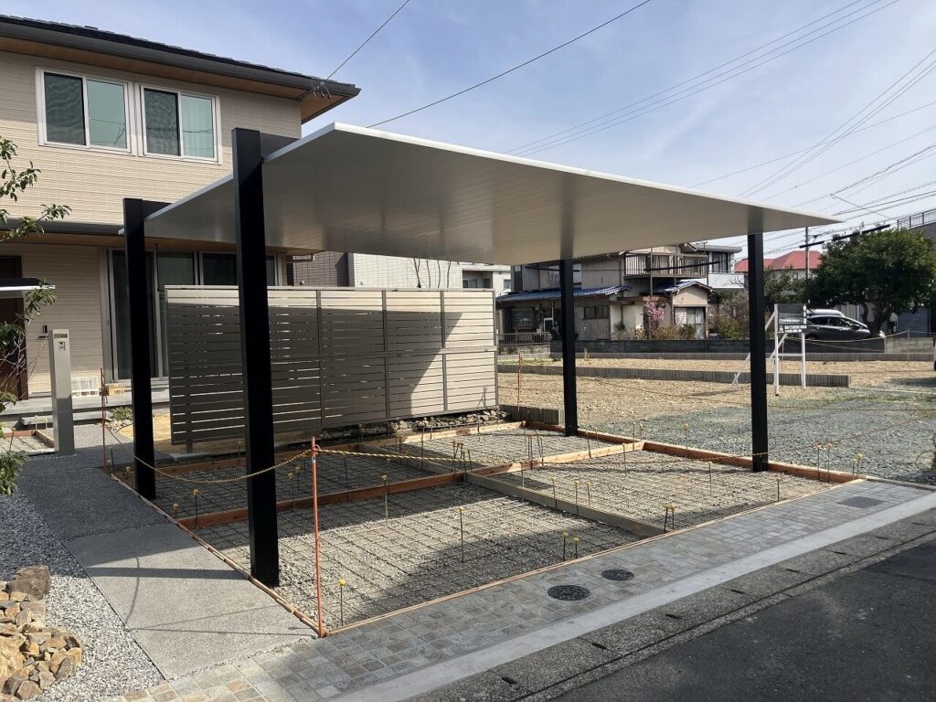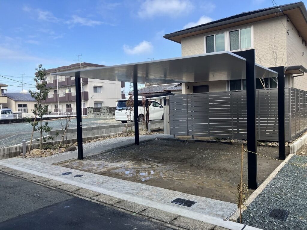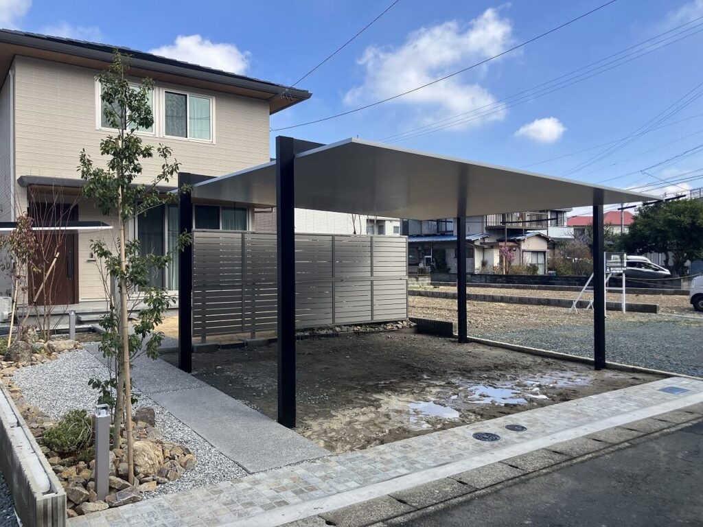 カーポート「LIXIL カーポートSC 2台用」とサイクルポート「LIXIL カーポートSCミニ」を設置しました。どちらも柱はブラック、屋根はナチュラルシルバーFのツートンカラーにしました。