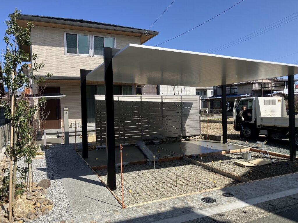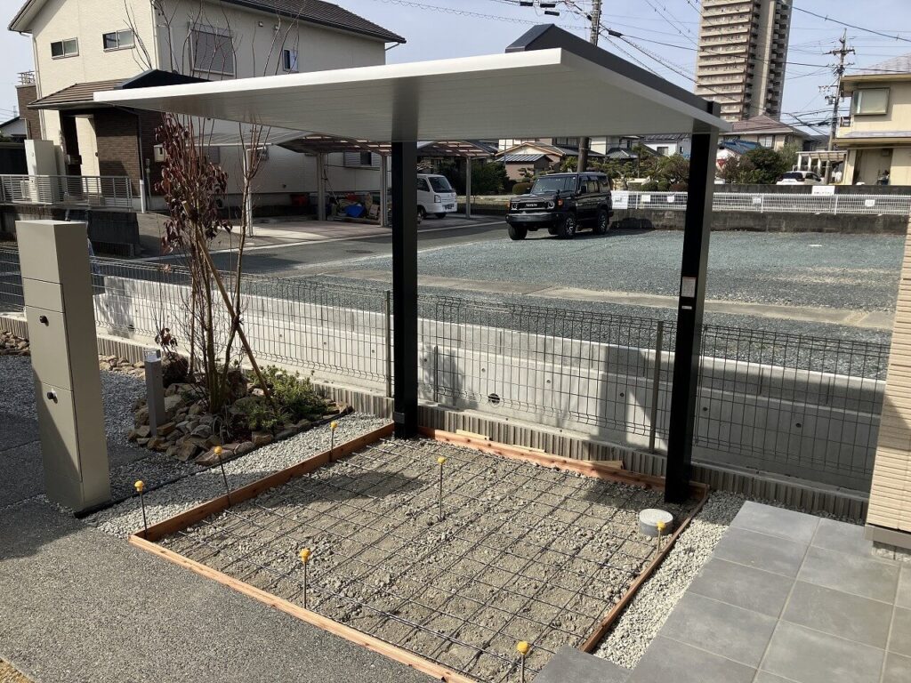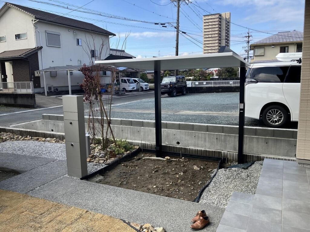 カーポート下はコンクリート刷毛引き仕上げ、溝はビリ砕石を敷きました。