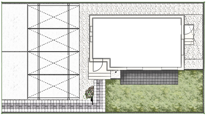 カーポート脇のアプローチはユニソンの化粧平板『リビオ』を2色で敷き詰めました。
