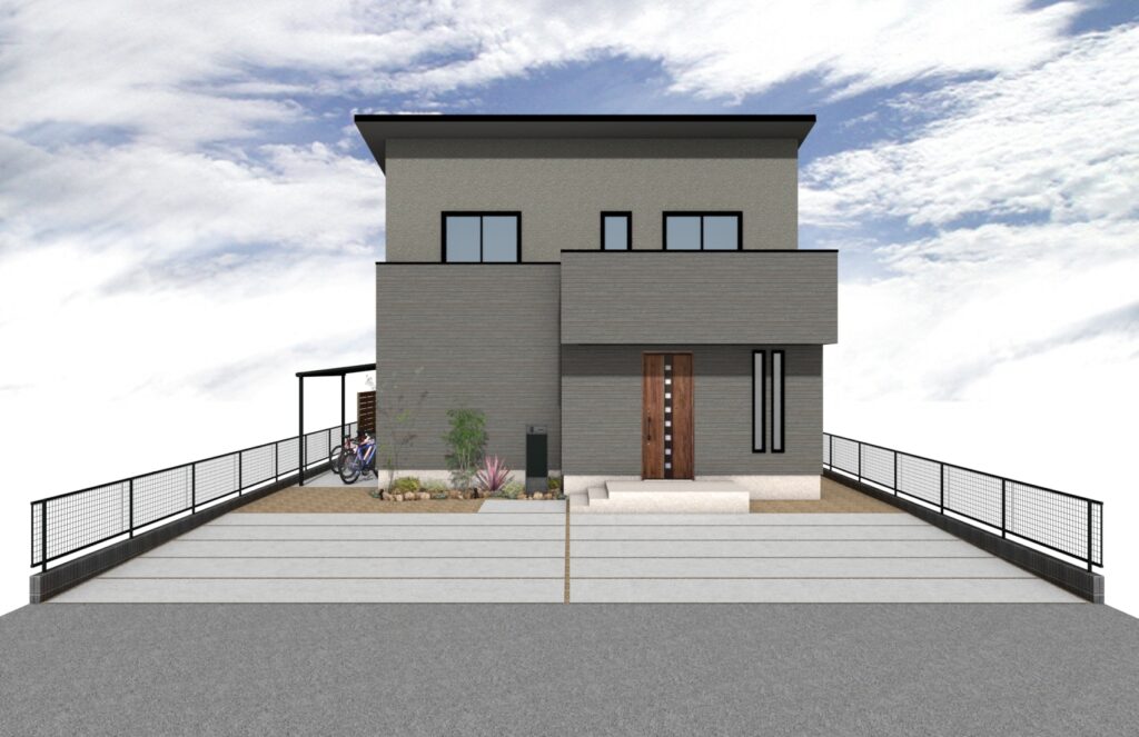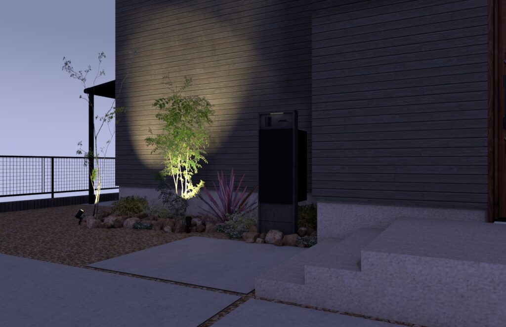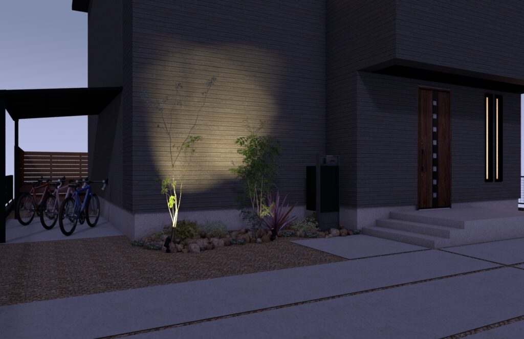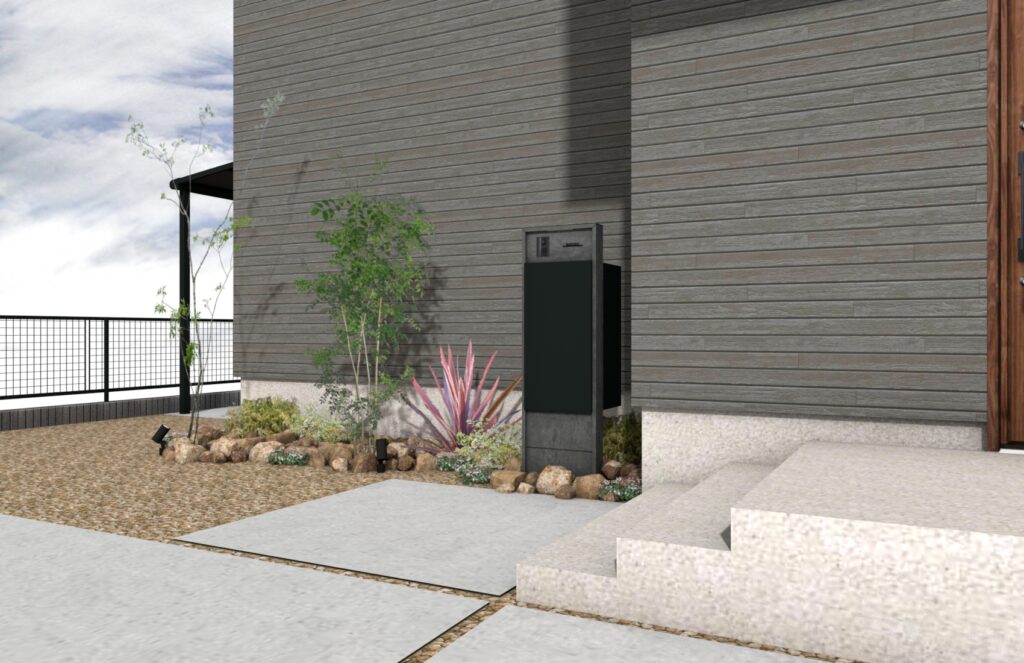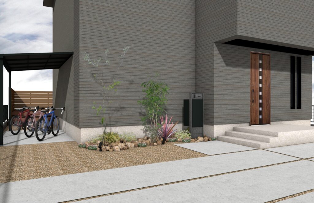ダークな色味を中心にシャープな印象でまとめた外構プランです。