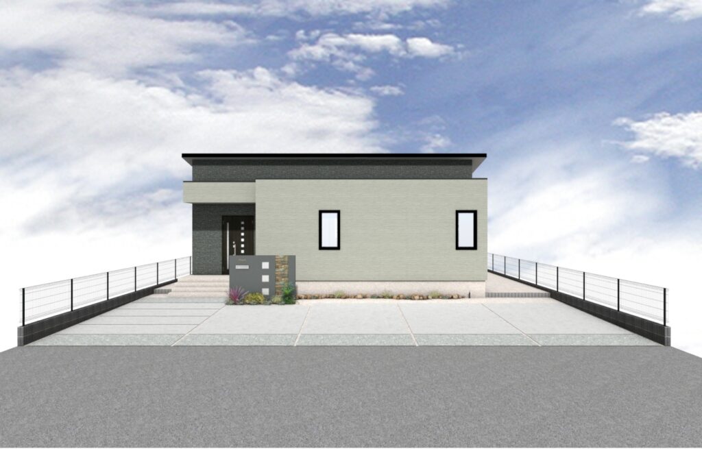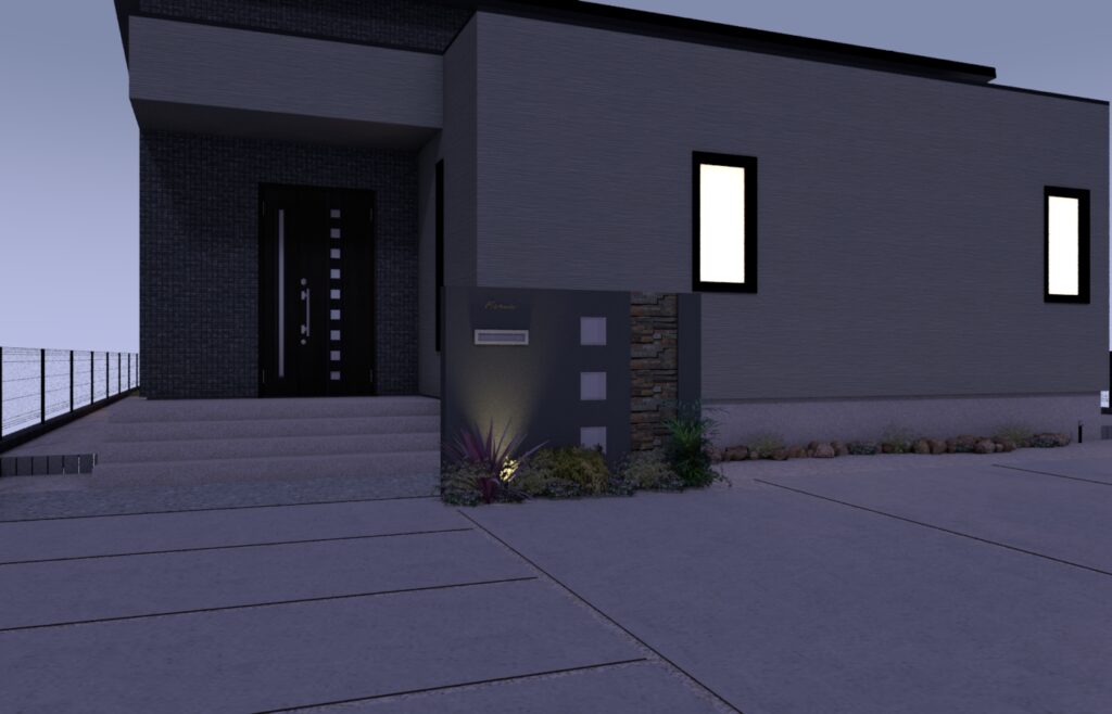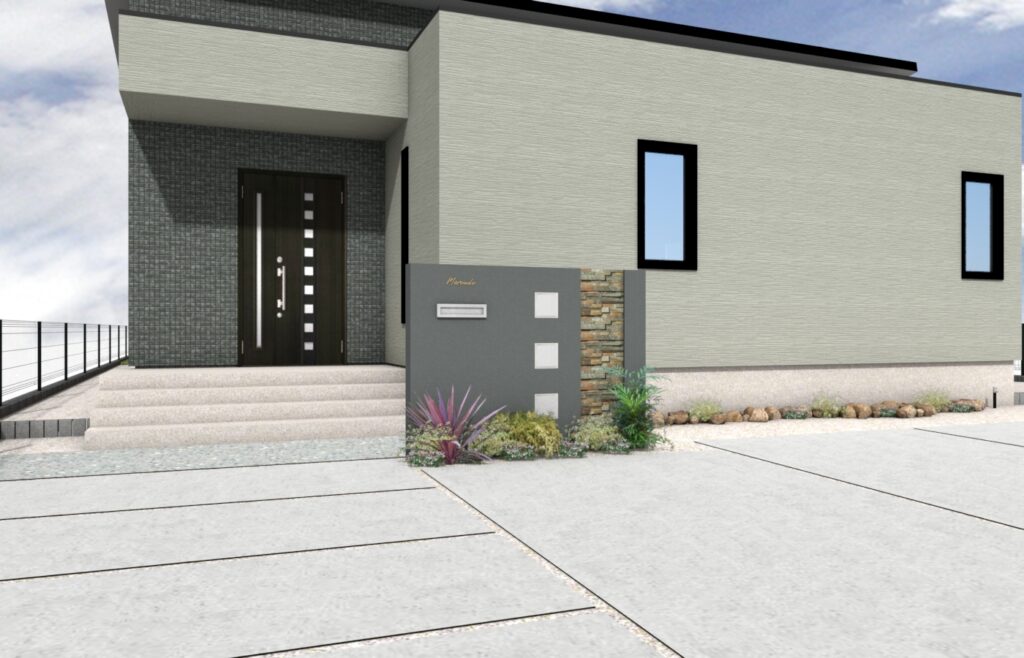 全体的に落ち着いたモノトーンでまとめたシックな外構プランです。