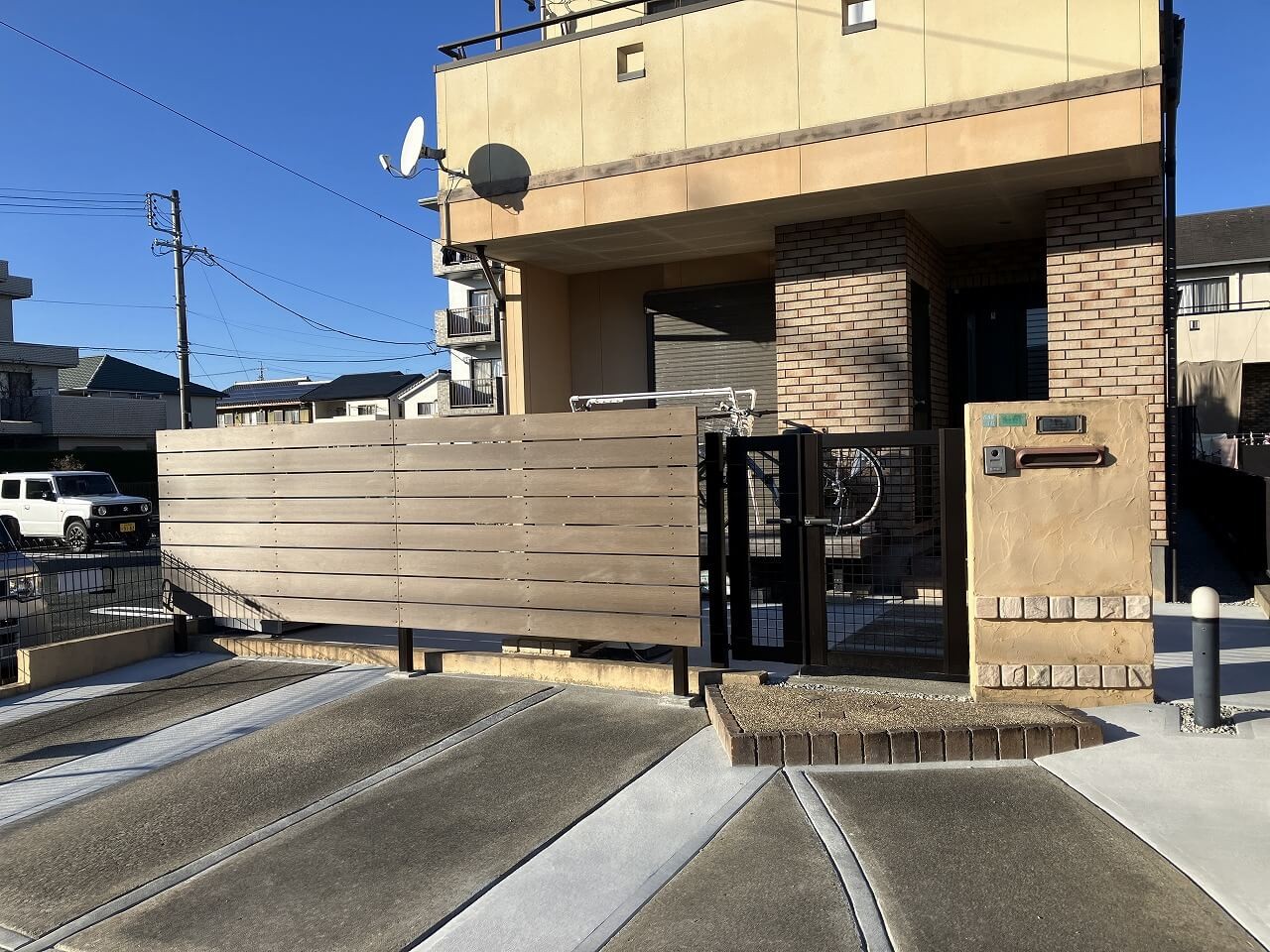 玄関横には道路からの目隠しとして、木調アルミの立て格子の目隠しスクリーンを設置しました。玄関タイルに柱の穴を開けて取り付けました