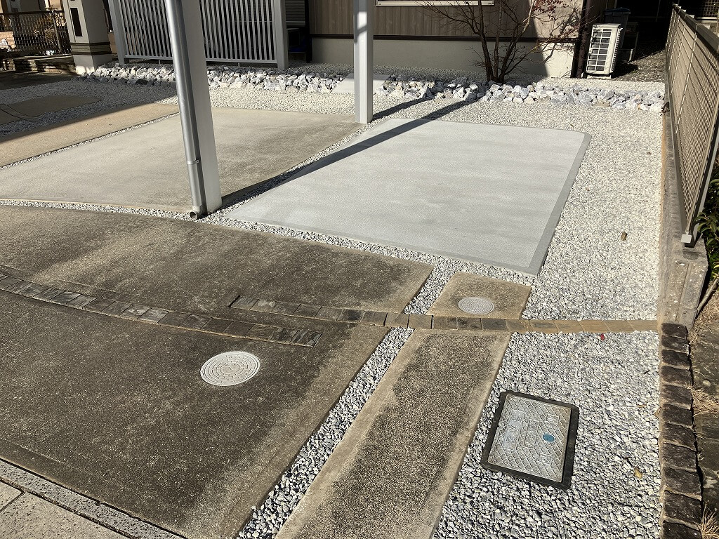カーポート横のスペースは、コンクリート敷きにすることでお客様用のゆとりある駐車スペースとして使えるようになりました。