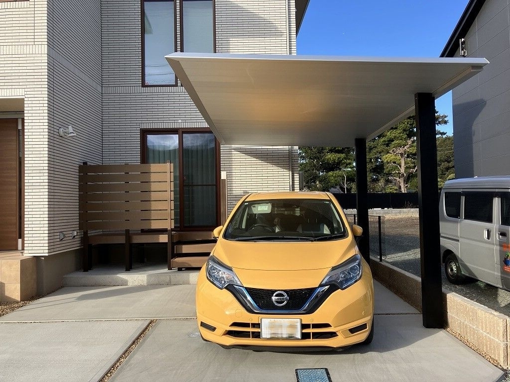 スタイリッシュなカーポートは外壁に合わせたホワイト系の色味をチョイス。