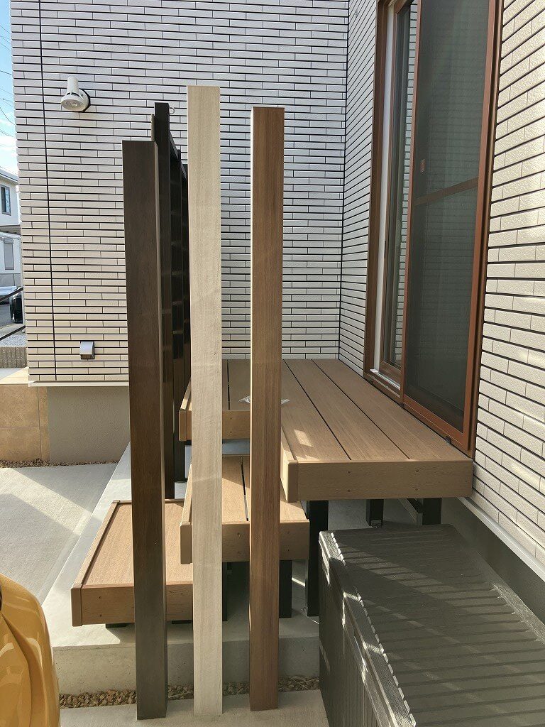 ウッドデッキの横には、色を変えたアルミ柱を並べて施工しました。