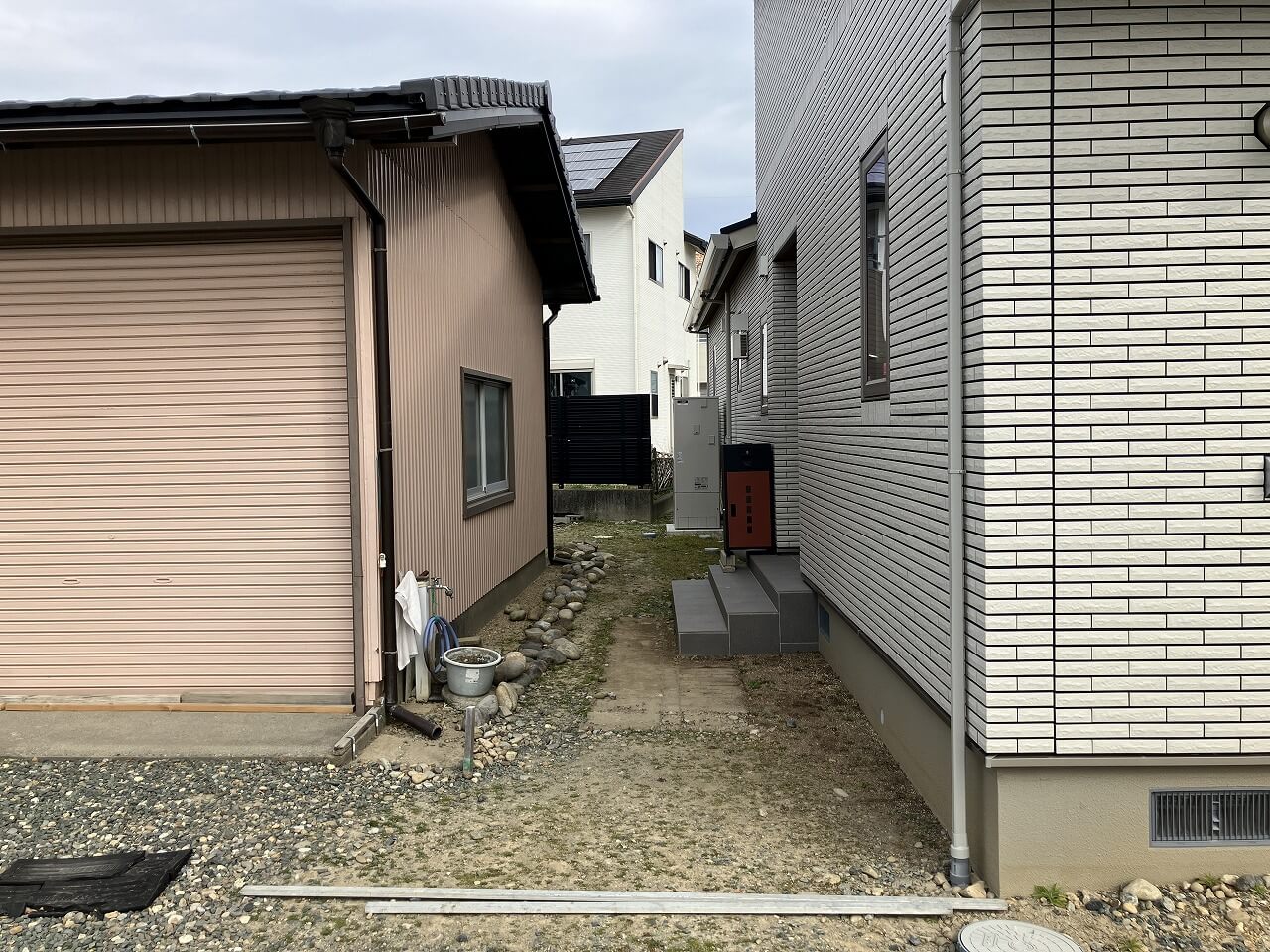 また、もともとあった納屋の雨樋から直接地面に水が落ちていたため、こちらも雨水桝へつなぎこみ。地面に流れ出る雨水をできるだけ抑える工夫も施しています。見た目のスッキリ感はもちろん、靴が汚れにくくなったことで、毎日の出入りがぐっと快適になりました。