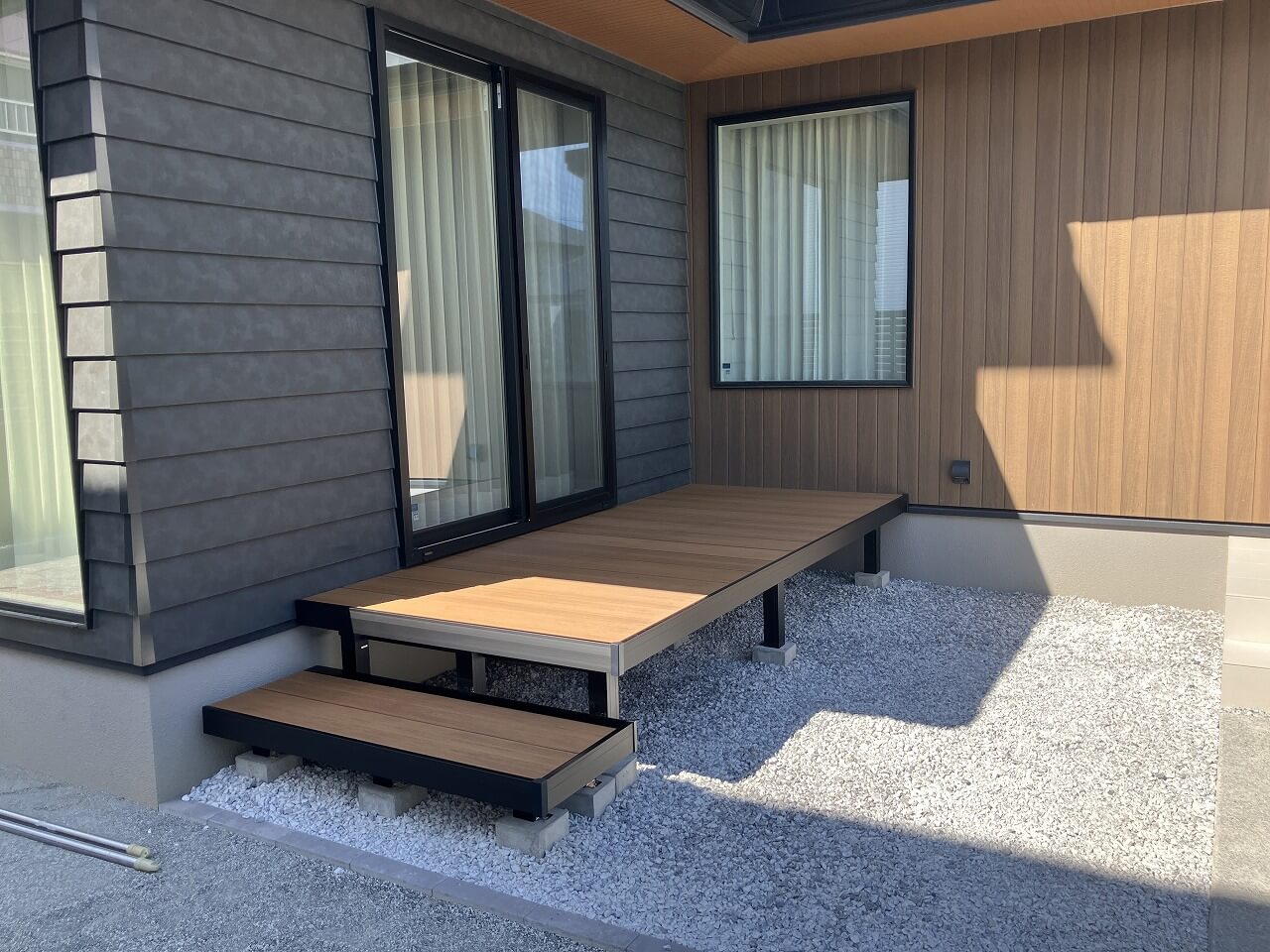 人工木デッキの幕板部分はアルミ板仕様で、見た目の印象を大切にしたこだわりの仕上がり。シンプルながらも一つひとつの要素がしっかりと主張し、全体のバランスを引き立てています。