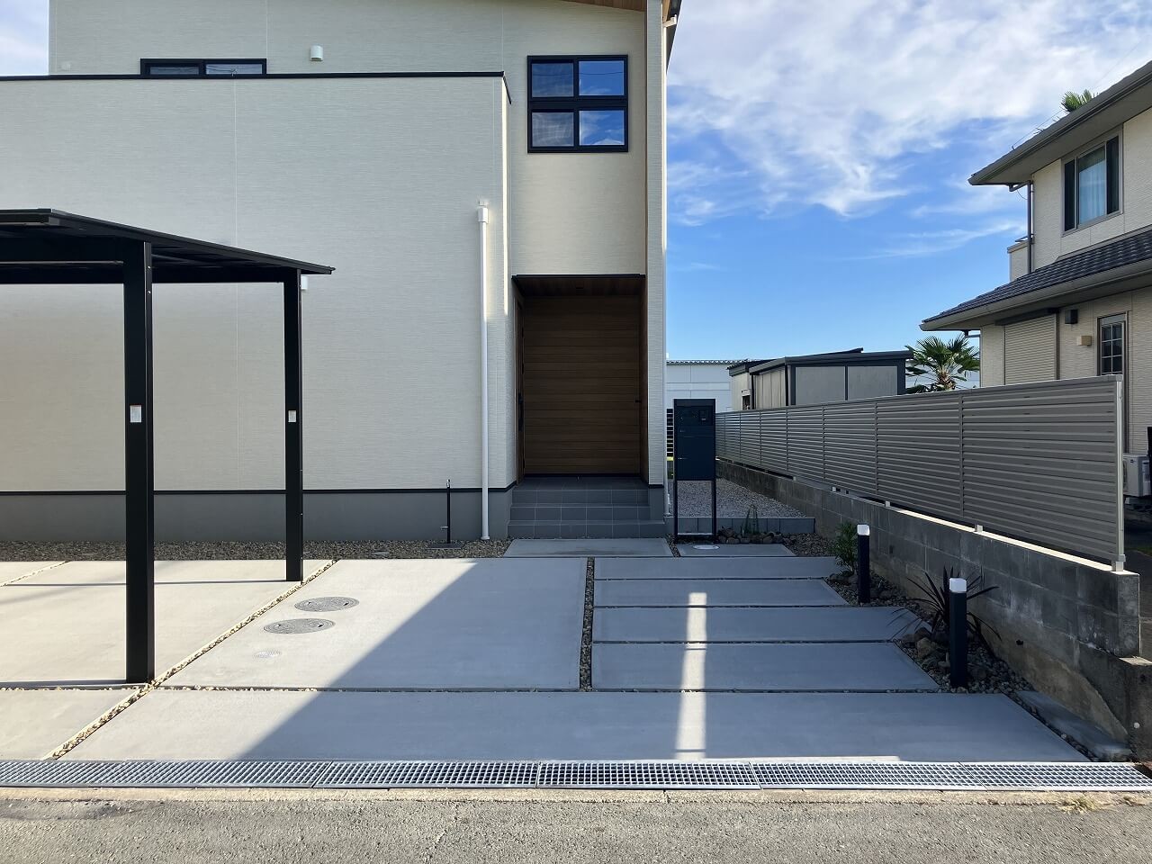 道路側溝の部分にはグレーチングを使い、見た目もすっきりと美しく。
