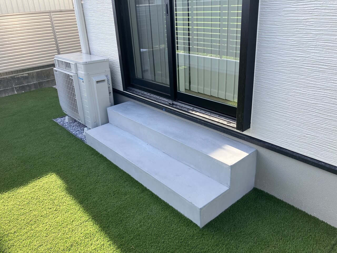 リビングからお庭へ出るところには、コンクリート仕上げの階段をつくりました。お天気のいい日はそのまま庭へ出て、人工芝の上で過ごすのも気持ちよさそう。リビングと庭が自然につながることで、毎日の暮らしに少しゆとりが生まれました。