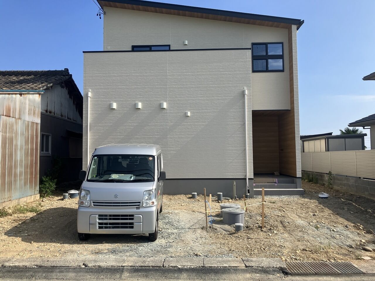 • 木調の角柱や植栽でやさしいイメージの新築外構です。|浜松市の外構・エクステリア専門店 まろうど