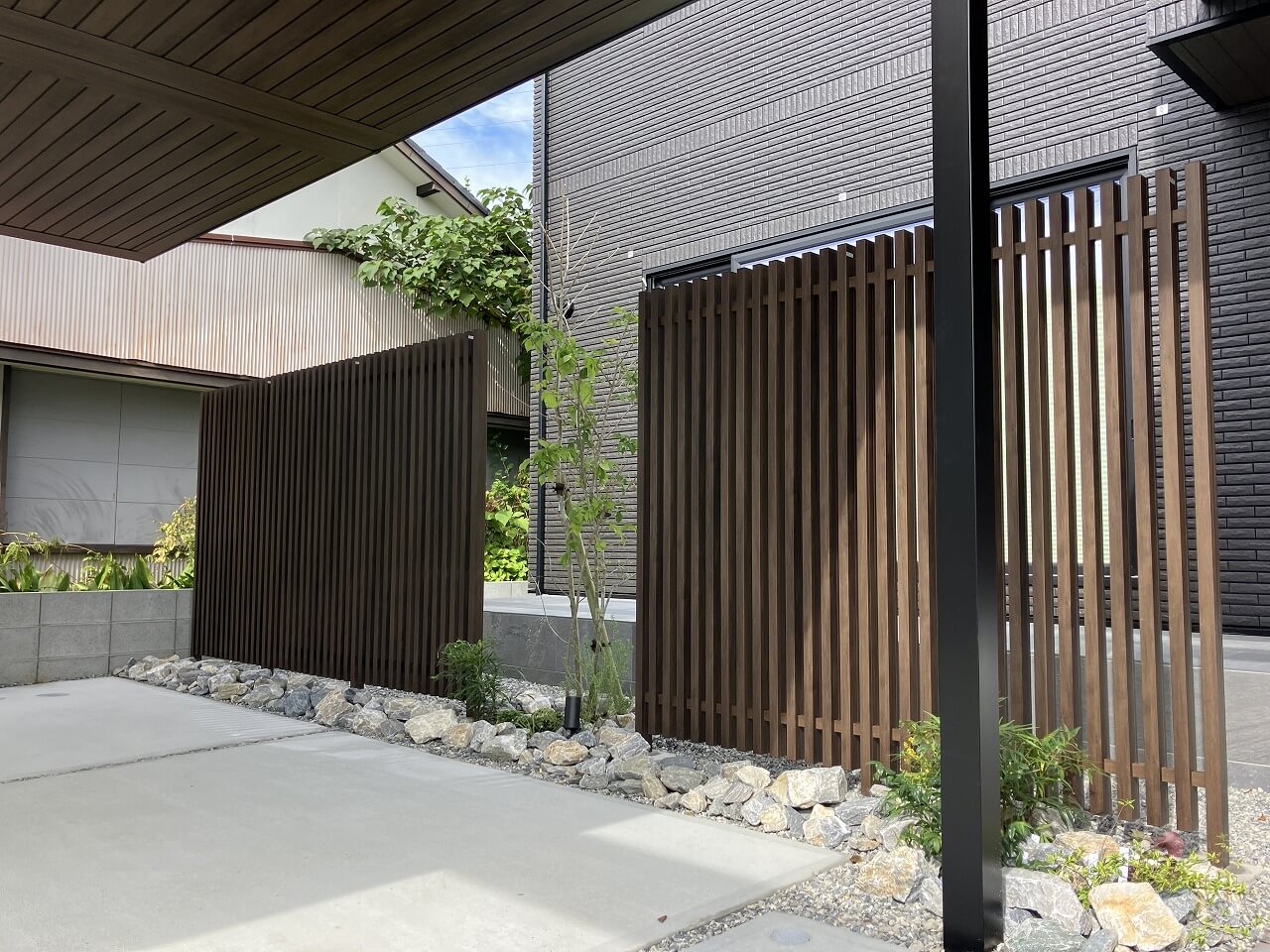 視線を程よく遮る縦格子を設けることで、プライバシーを確保しながら、圧迫感のない開放的な空間を演出しています。直線的なデザインと木調素材が外構全体と調和し、機能性と美しさを兼ね備えた目隠しとなっております。