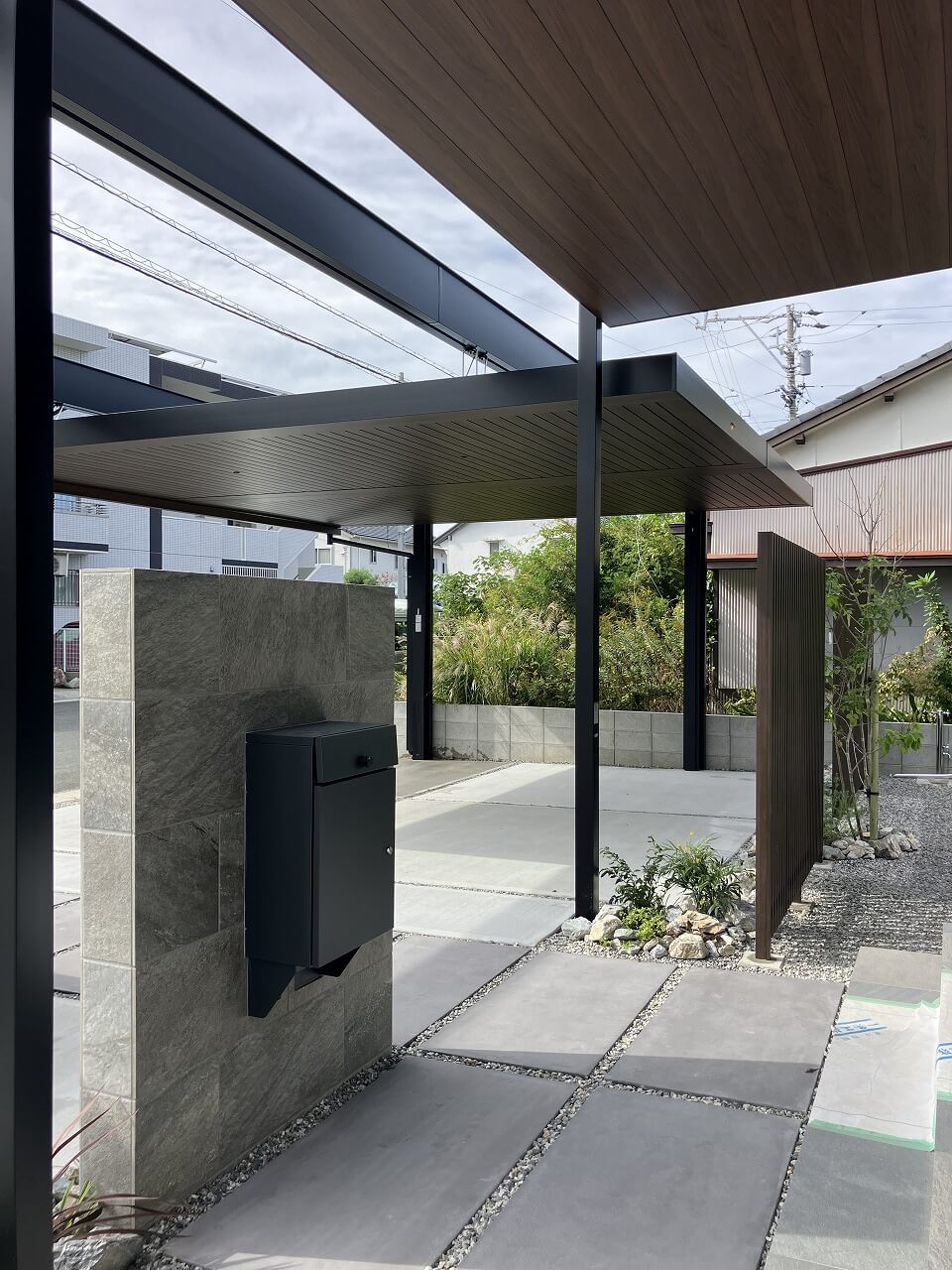 屋根下空間にはゆとりを持たせ、日常の使いやすさと美しさの両立を実現しました。カーポートからアプローチ、門まわりまでを一体的に設計することで、視線の流れが自然につながり、外構全体に奥行きと品格が生まれています。木調素材や植栽を組み合わせることで、無機質になりすぎない柔らかさもプラスしました。
