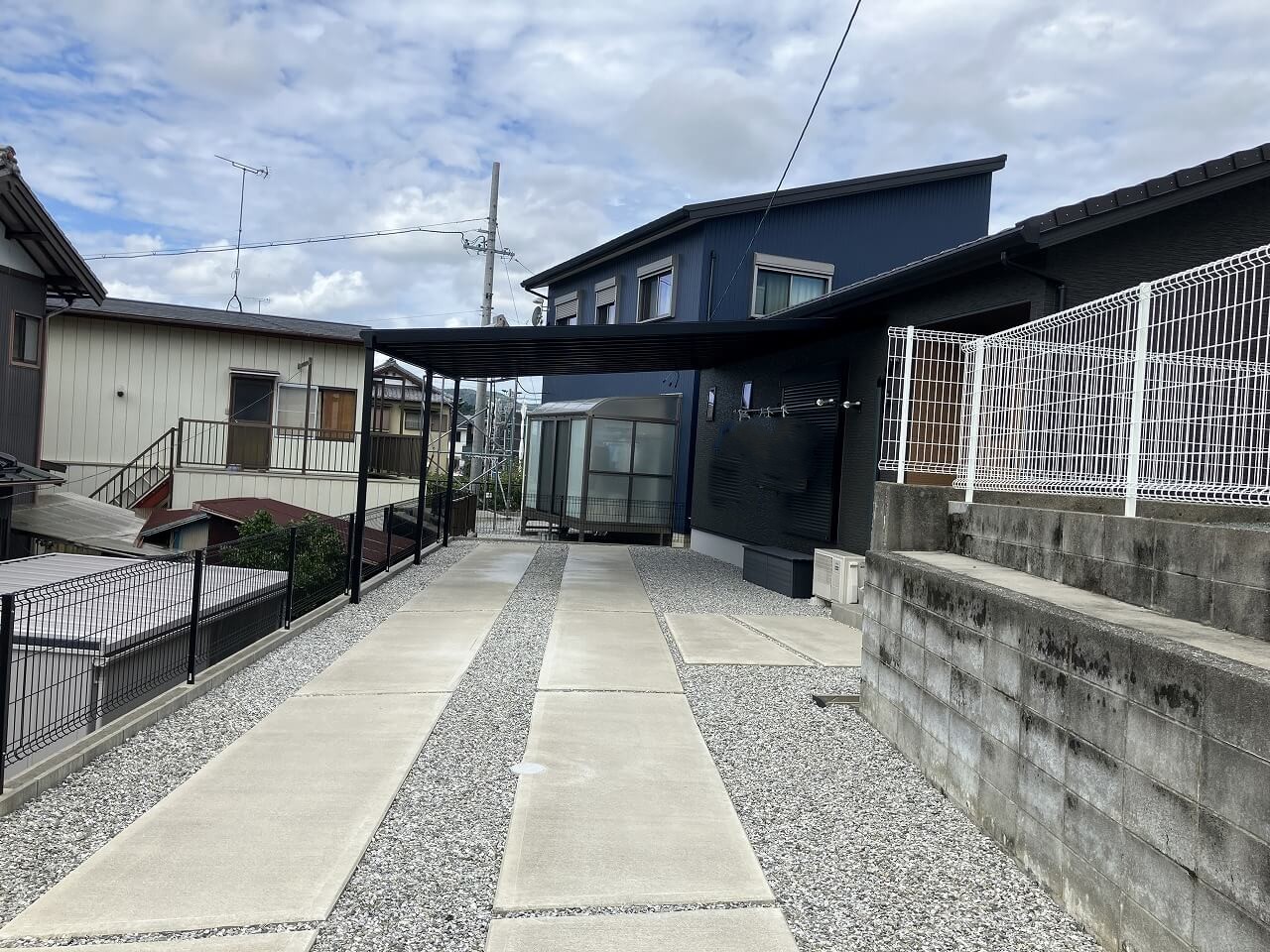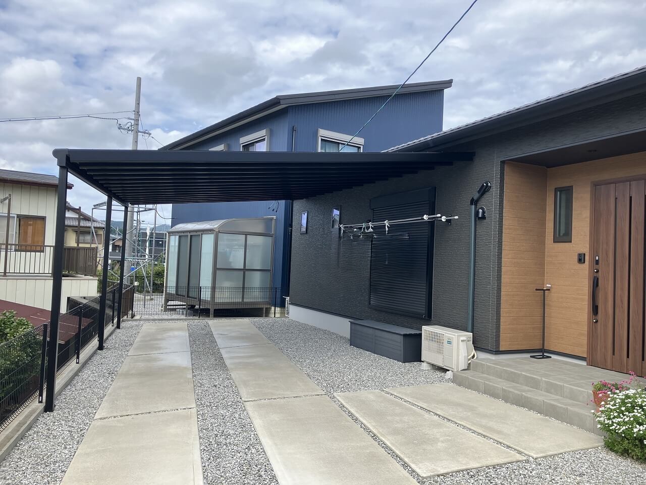 • ブラック上吊りタイプのカーポートが映える新築外構です。|浜松市の外構・エクステリア専門店 まろうど
