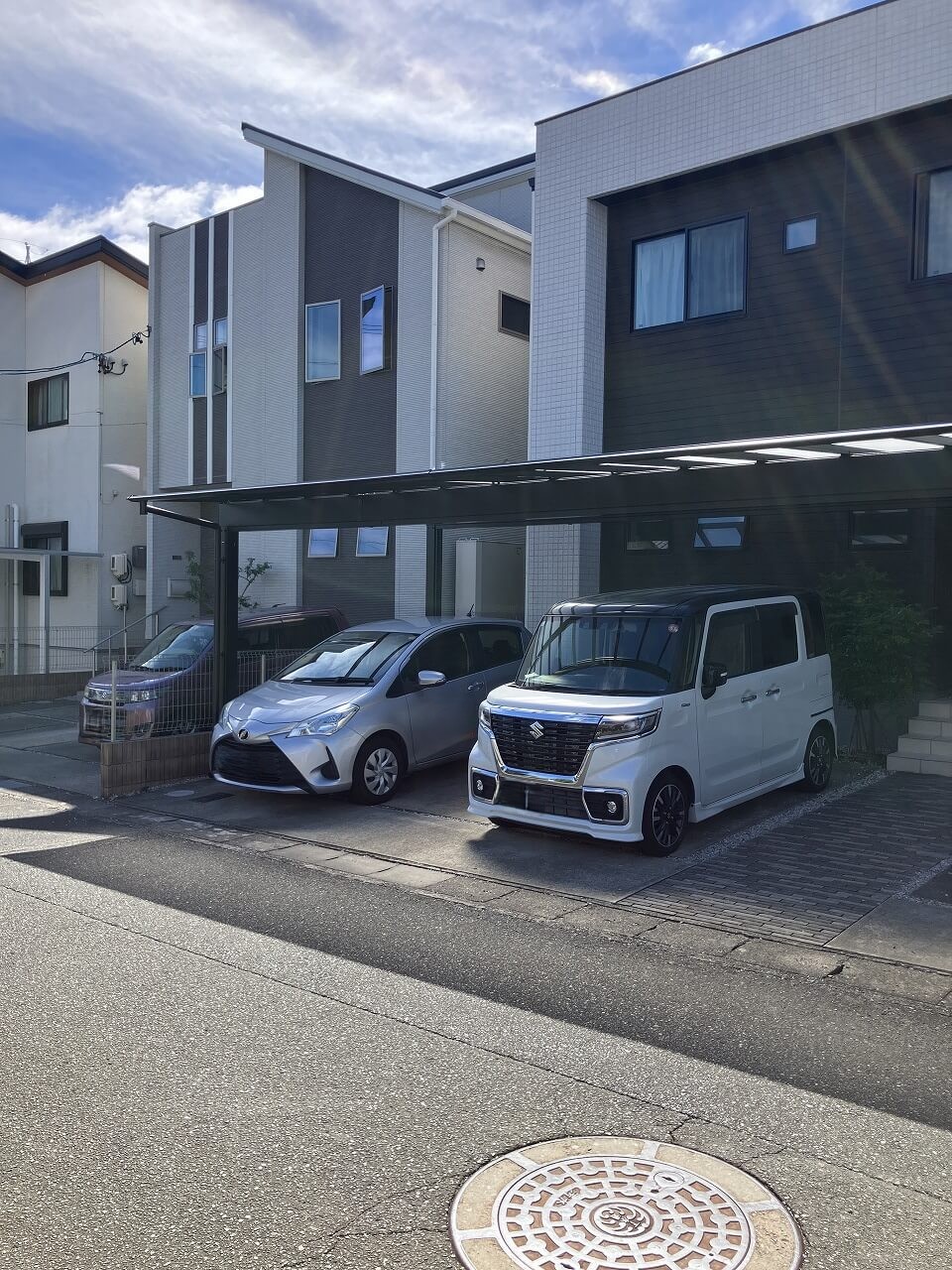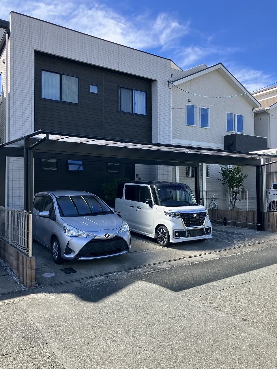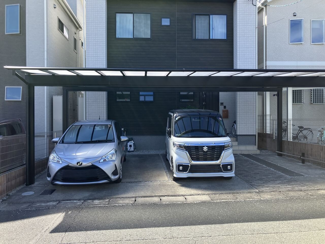 2台分をゆったり覆うことで、駐車のしやすさはもちろん、日常の動線にも余裕が生まれました。