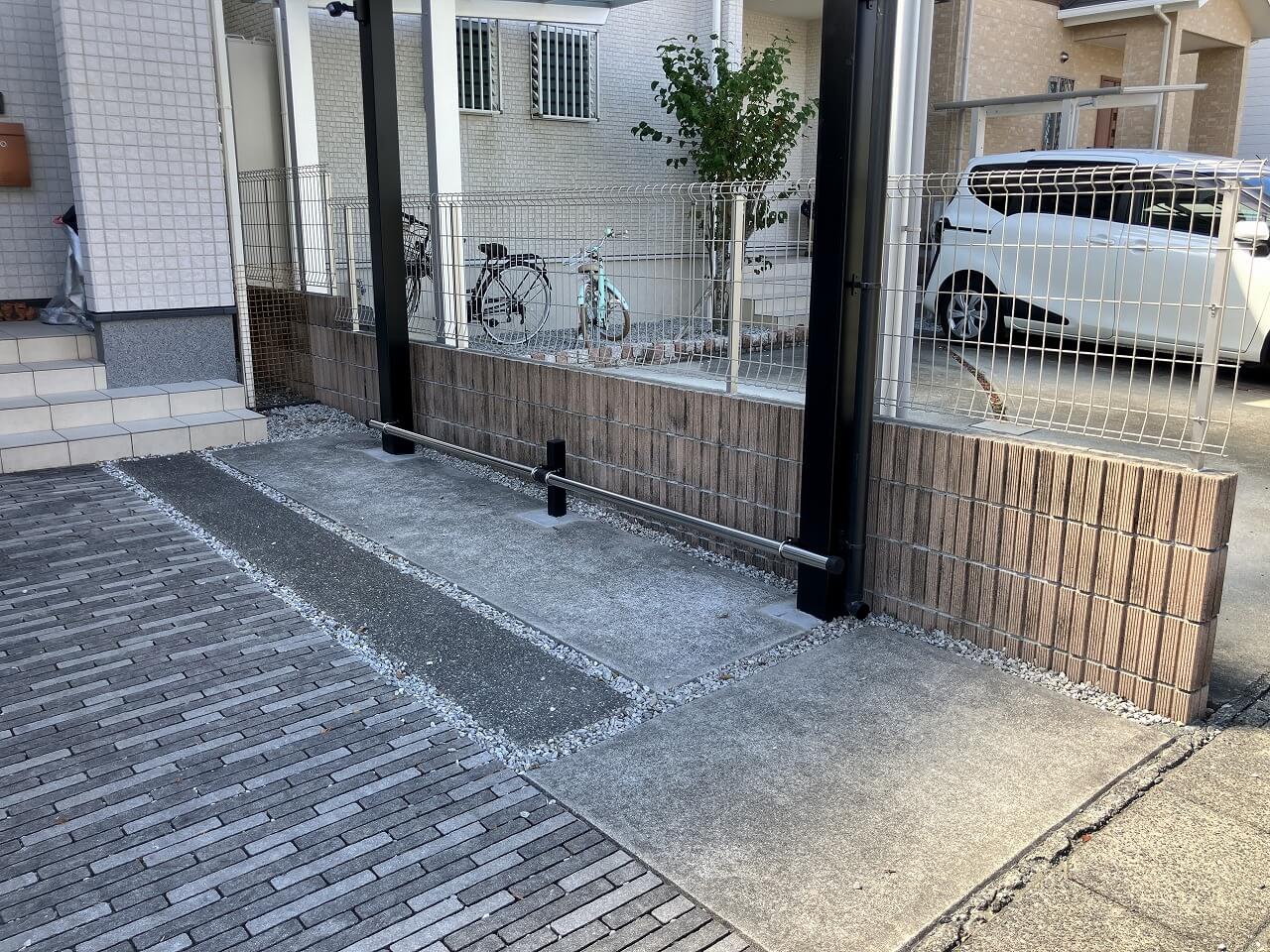カーポート下の一角にサイクルバーを設置し、自転車を安定して置けるスペースを確保しました。