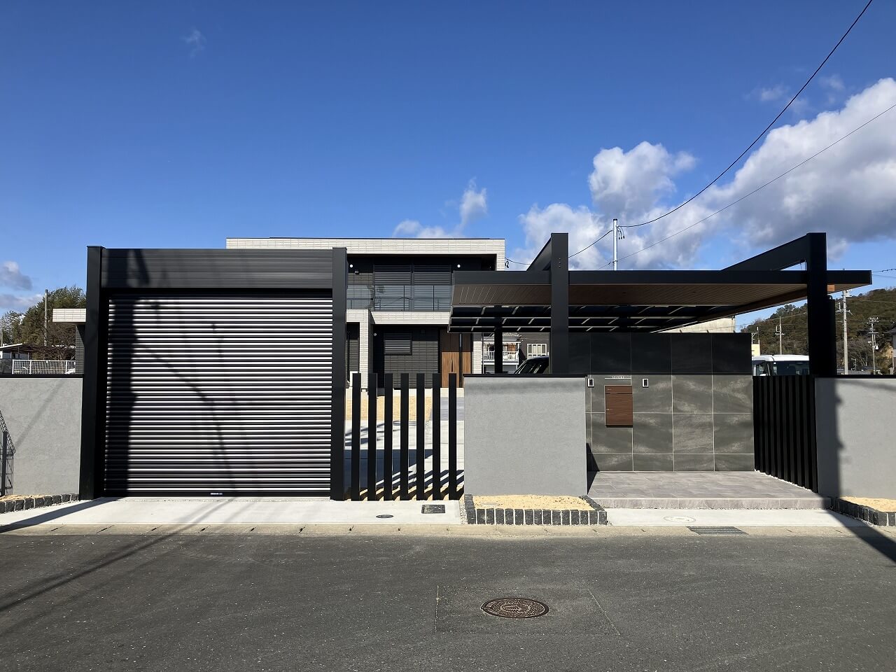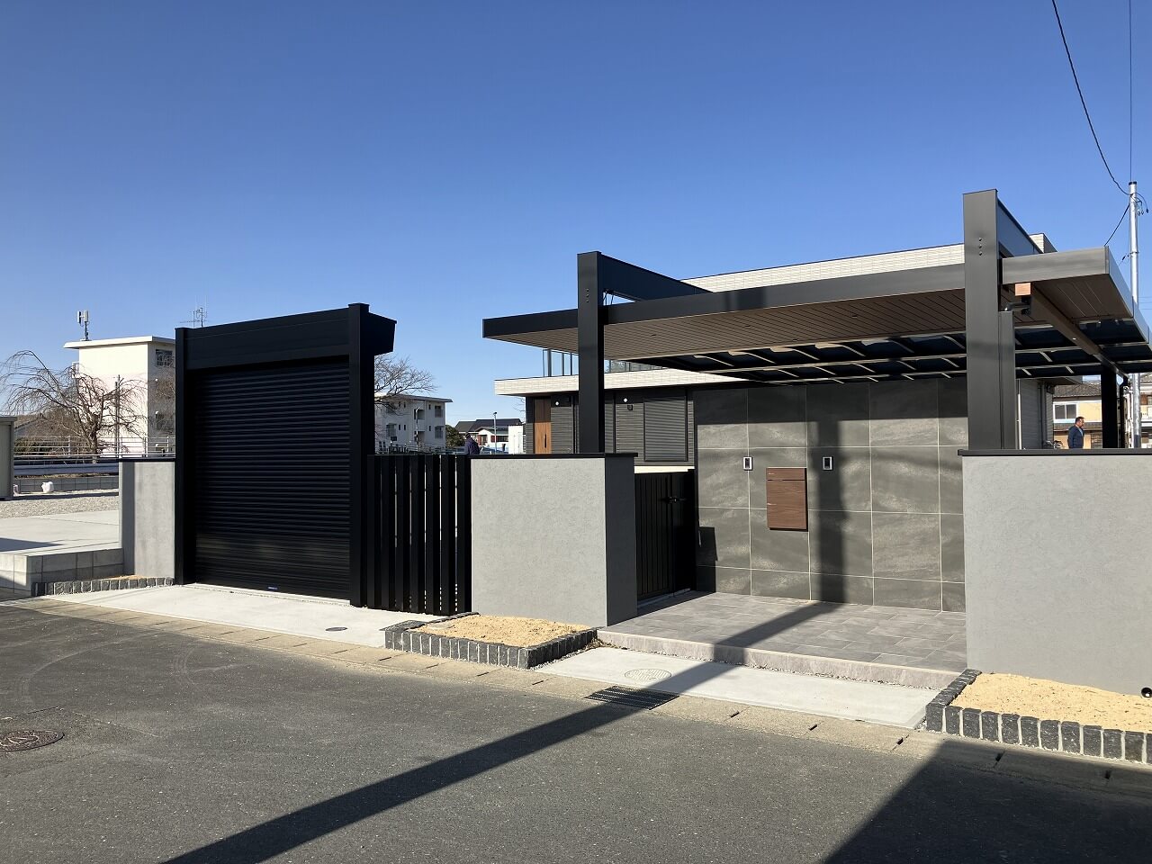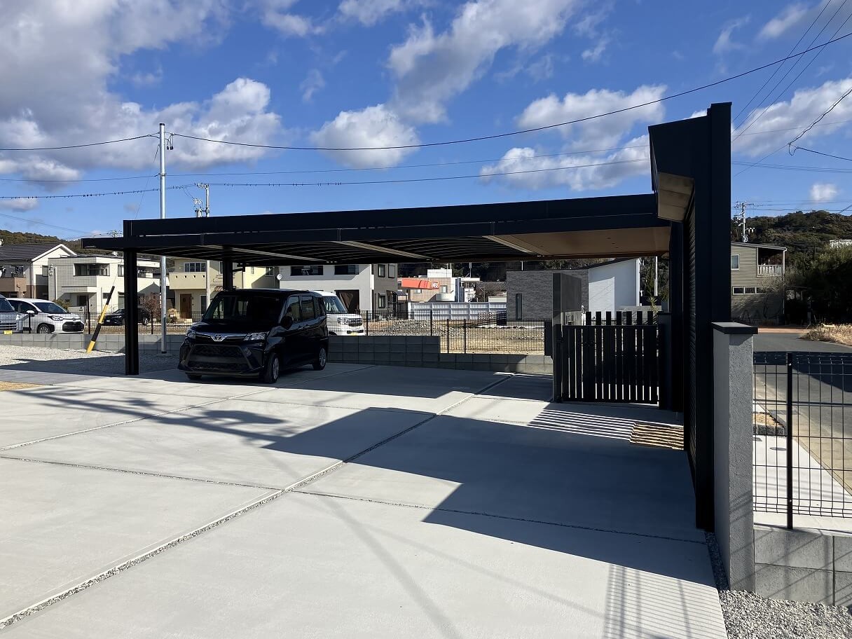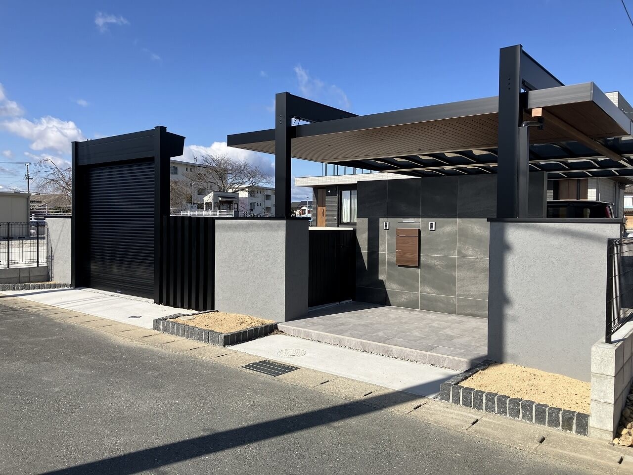 広大な敷地に、直線を効かせたモダン外構。ブラックのフレームが力強いカーポートとシャッターゲート。無駄を削ぎ落としたフォルムが、空間全体を引き締めています。