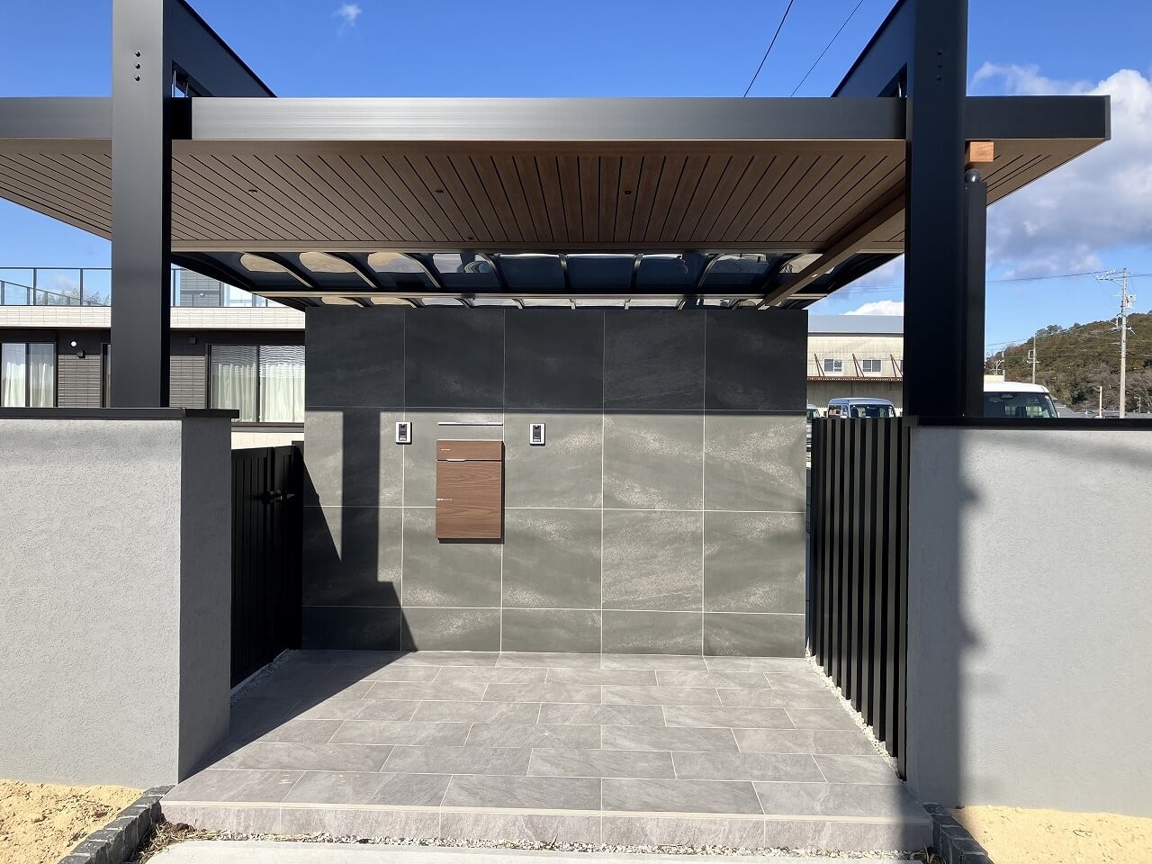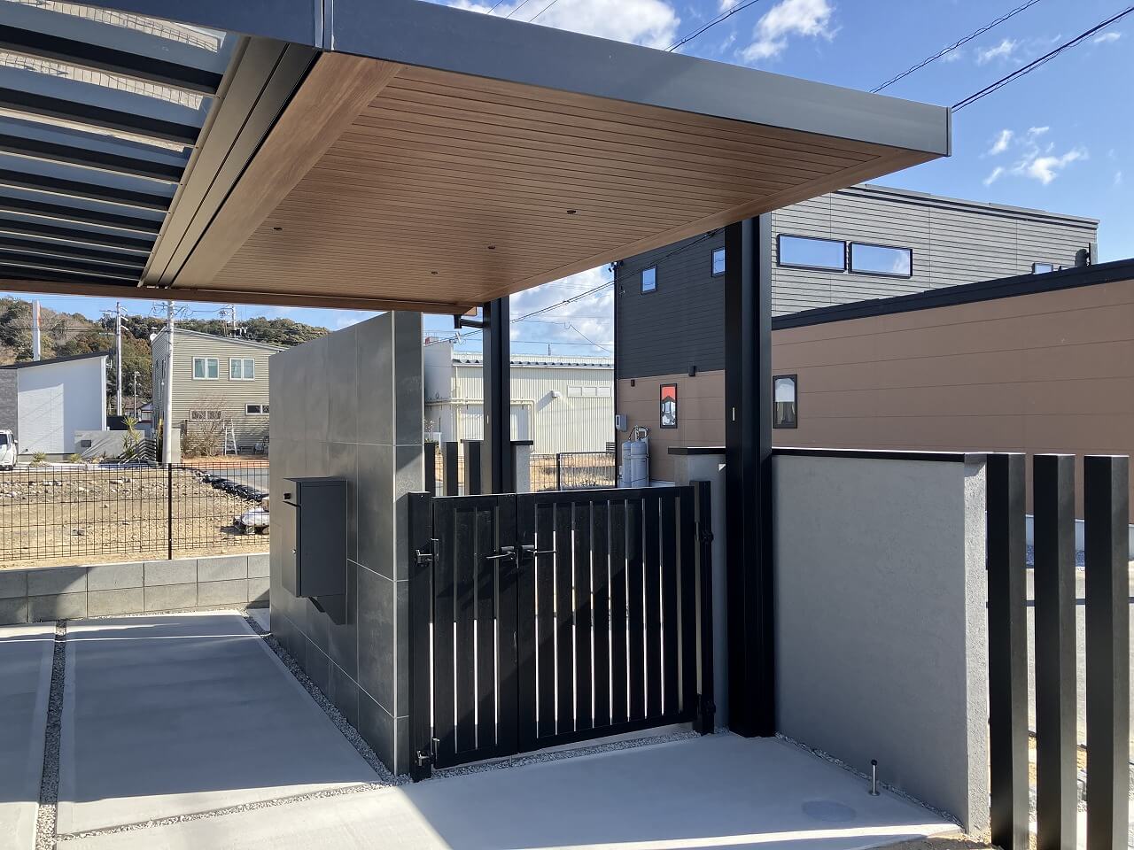 ブラックの柱・シャッター・縦格子。グレーの大判タイルと塗り壁。色数を絞ることで、空間全体に統一感と高級感が生まれています。そこに天井の木目が入り、無機質になりすぎない絶妙なバランスに。