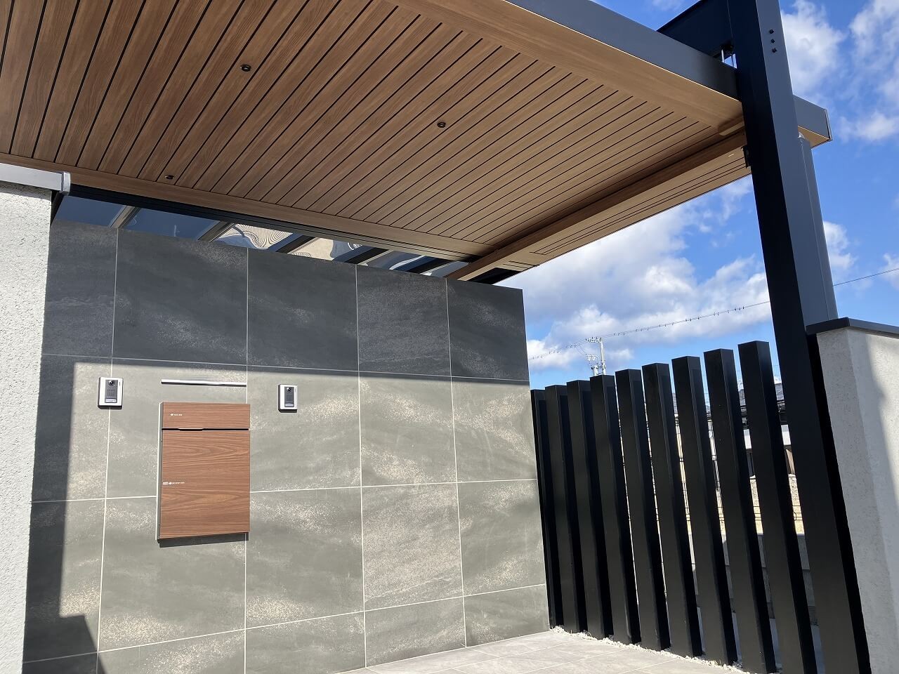 エントランスには大判の濃色タイルを採用。重厚感のある壁面と縦格子フェンスが、ほどよい抜けをつくりながらもプライバシーを確保しています。天井の木目がさりげないアクセントとなり、無機質になりすぎない絶妙なバランスに。