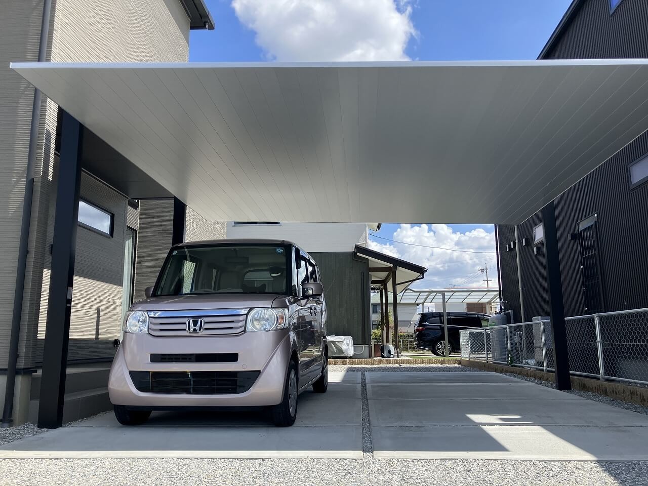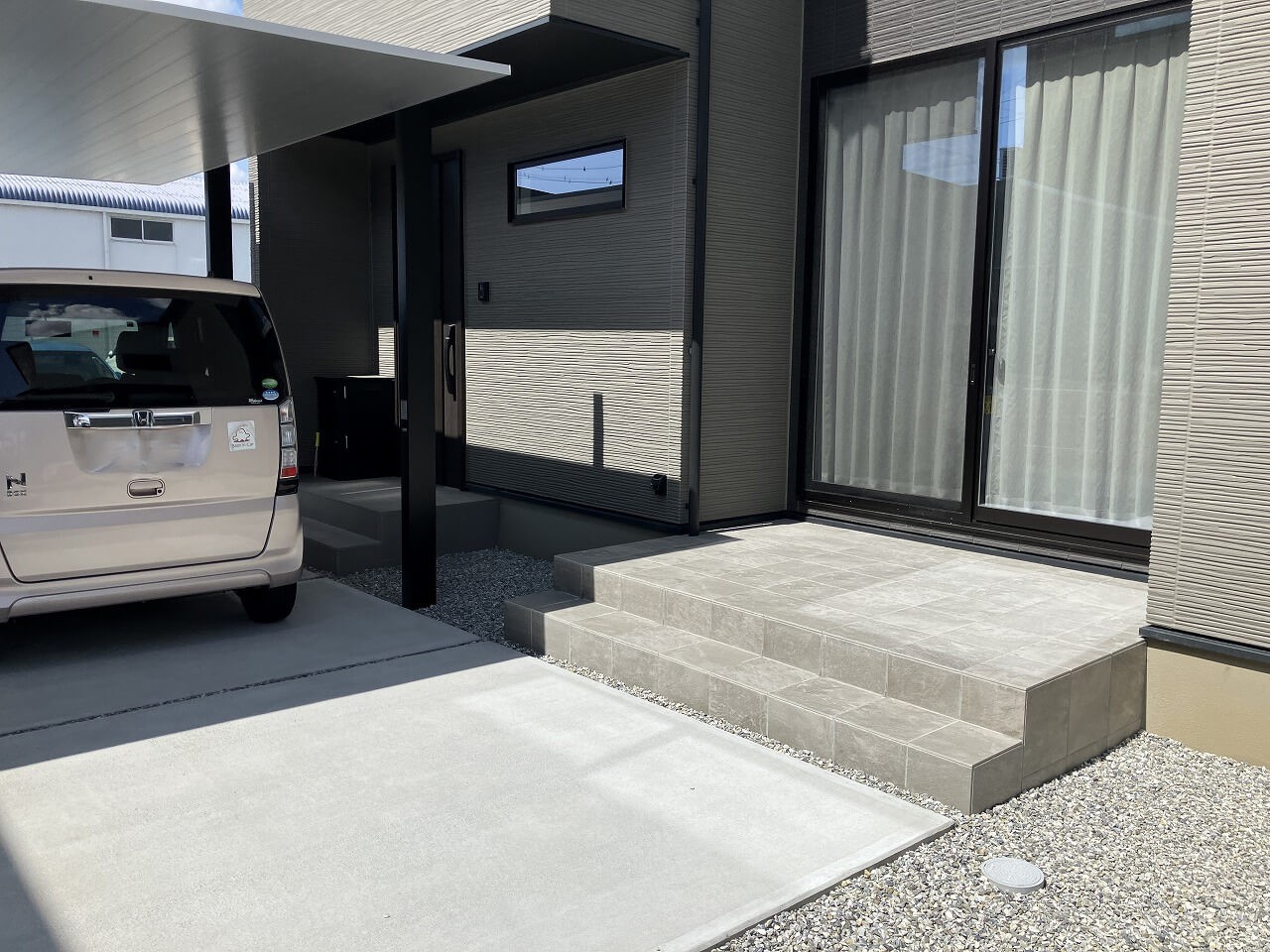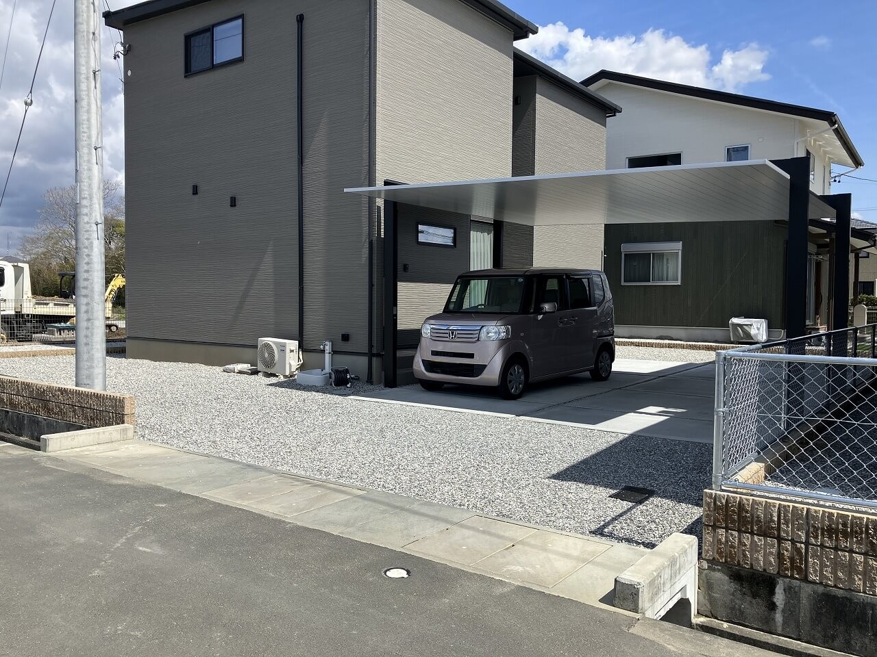 カーポートSCの設置、駐車場のコンクリート施工、そしてお庭側にはタイルテラスの施工、建物まわりには防草シートと砕石敷きを行う、外構全体を整える工事となりました。