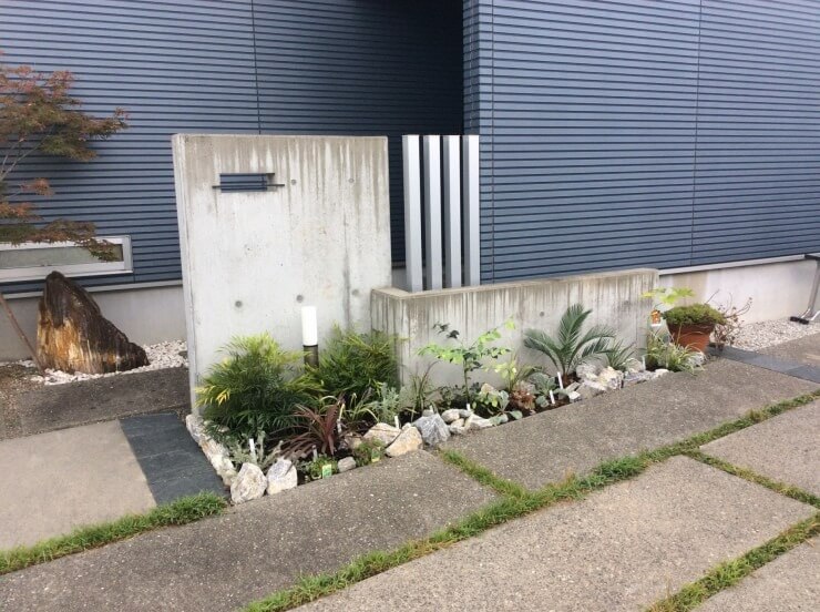 モダンな雰囲気のコンクリート打ちの門壁に合わせて、石灰岩と葉先の尖った植栽類で感じ良く植えさせて頂きました。照明は新しく照らす範囲の広いポールライトに変更しました。