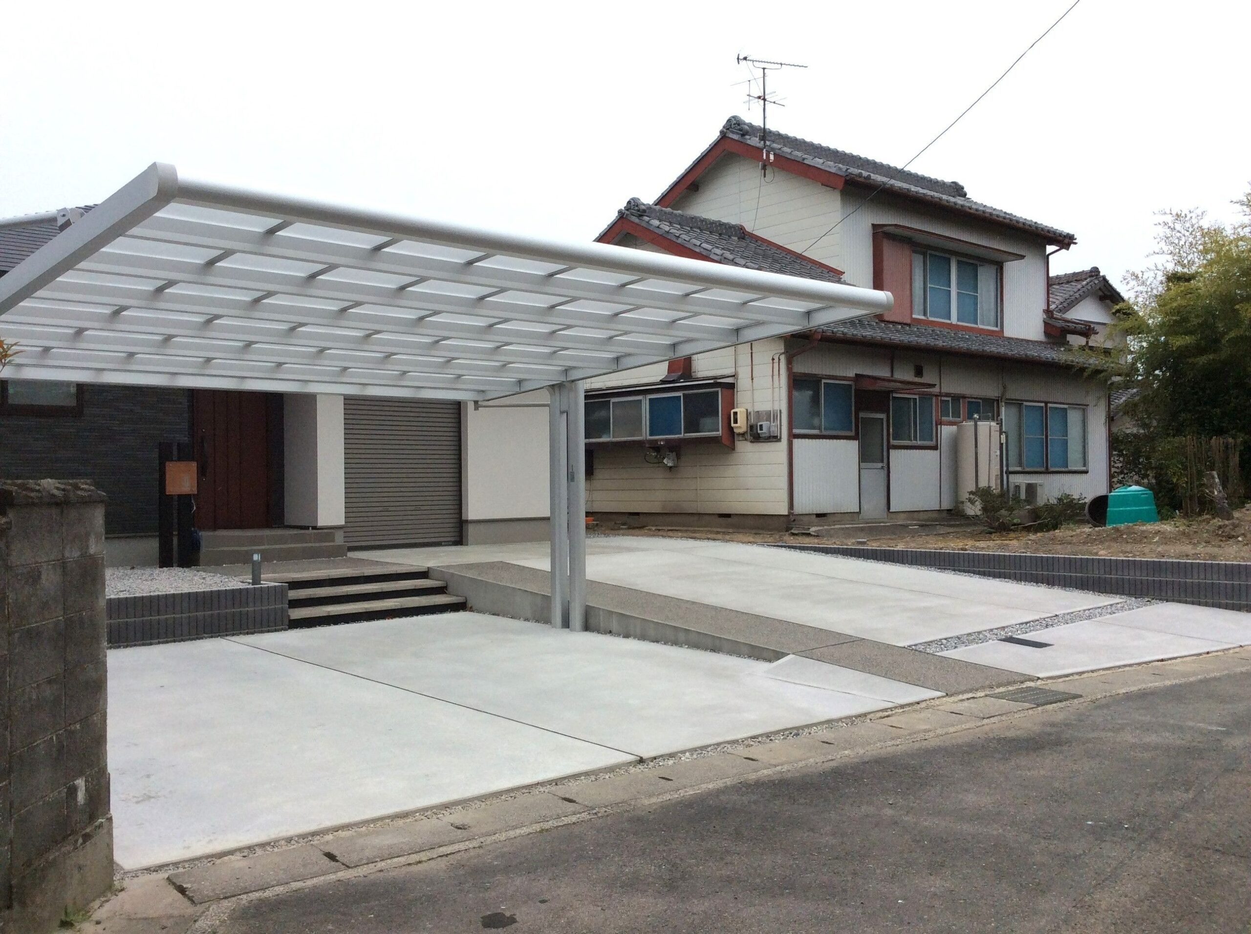 ビルトインガレージに合わせた勾配と駐車場の緩やかな勾配。カーポートは後方に柱がくるタイプを採用し、道路側に邪魔な柱が無くスムーズに駐車できるよう計画しました。カーポートはスタイリッシュな三協アルミの「フォーグ」です。