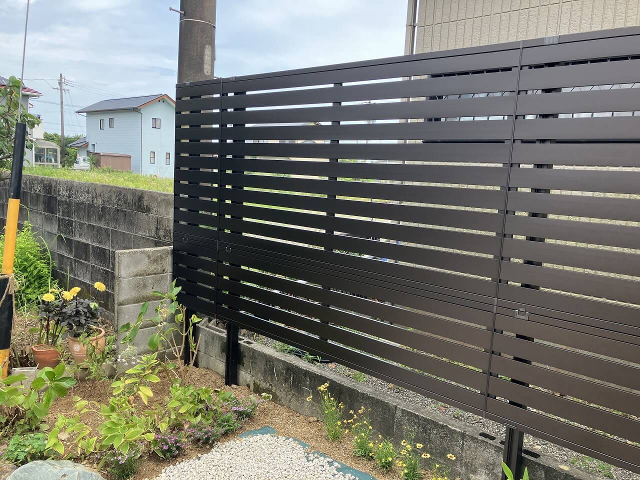 お隣様との間の生垣を伐採した後、目隠しフェンスを付けたいとご希望のO様。完全な目隠しではなく、風と光が少し入る横スリットタイプのフェンスを採用しました。フェンスの上段部分を設置後、下の空いている部分も目隠しができる方が良いということで、下段部分も追加で設置しました。スリットがあるので圧迫感の少ない目隠しができるようになり、快適で安心なお庭周りとなりましたね。